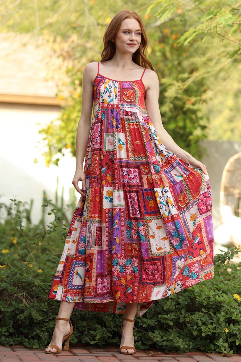 VERSATILE TANK OVERDRESS HAS SOFT FLOWING BLACK BUTTER FABRIC PANELS FOR AN ULTRA MOVING EFFECT.