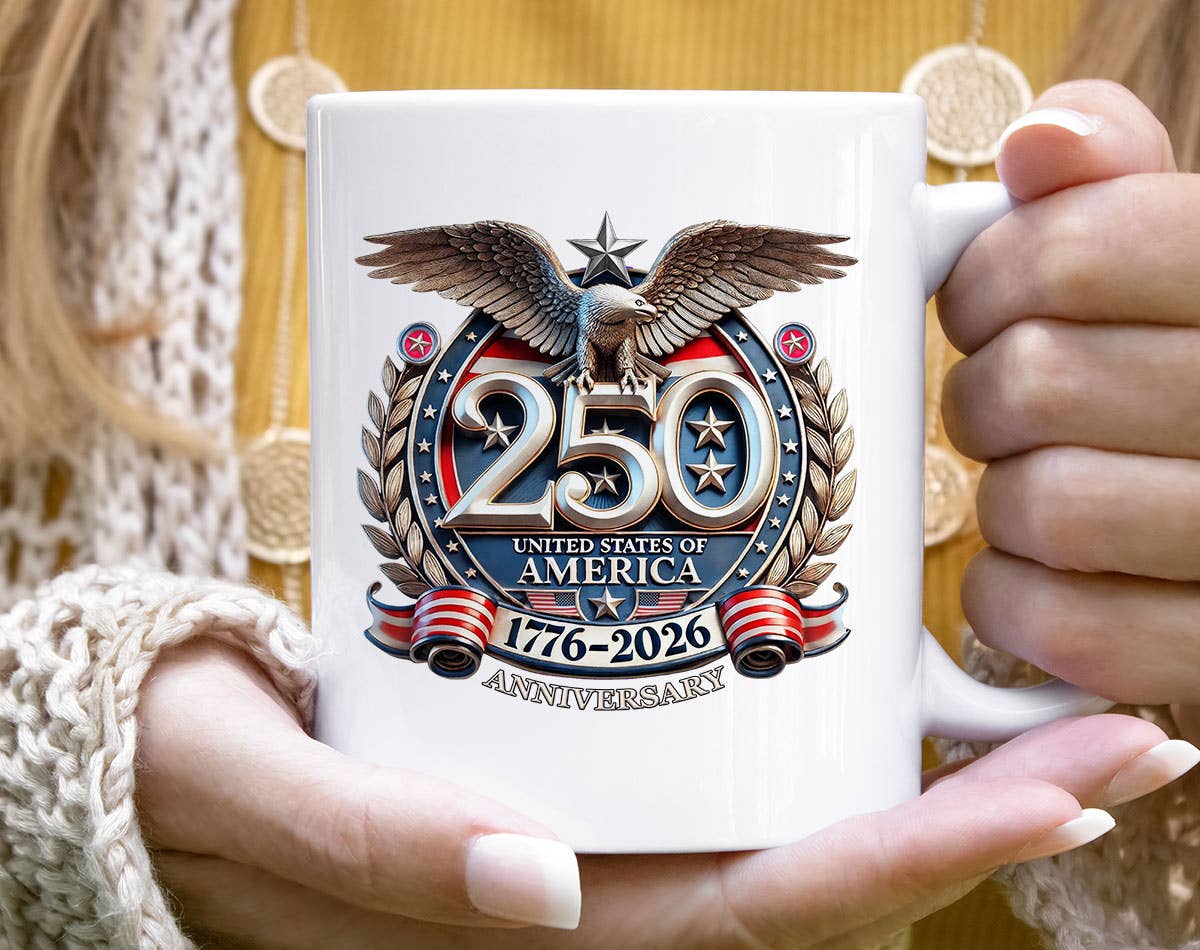 Celebrate American heritage with a fresh twist. Our officially licensed America250® Patriotic Flags mug features hand-painted flags with a snappy red bow and a commemorative logo. A timeless, elevated All-American look. Perfect for July 4th mornings, summer entertaining, and everyday use, this ceramic mug makes a thoughtful hostess gift, seasonal accent, or year-round favorite for coastal and Americana-inspired homes. Why retailers love it: • Strong appeal for July 4th & America 250th celebrations • Coastal-preppy design with broad giftability • Original artwork exclusive to The Muddy Dog • Easy add-on item with great margin Perfect for coffee, tea and hot chocolate, our 15 oz. premium ceramic mug features a large comfortable handle for easy gripping. It'll quickly become a favorite! + Dishwasher and microwave safe + Printed in the USA