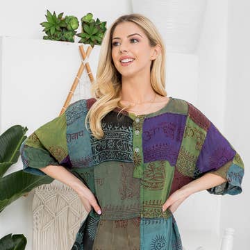 SKU: TP23375 LATTE REG Made in India Aesthetic: Bohemian and Western Care Instructions: Machine wash Embellishment: Embroidered Fabric: Rayon & Cotton Fit: Contemporary and Missy Neckline: V-neck Occasion Theme: Christmas and New Year Occasion: Everyday and Holiday Pattern: Patchwork Season: Spring/Summer Sleeve Length: 3/4 Sleeve Product Language: English Product Materials: Recycled Packaging: Reduced Production: Ethically sourced, Fair trade, and Low-impact transport
