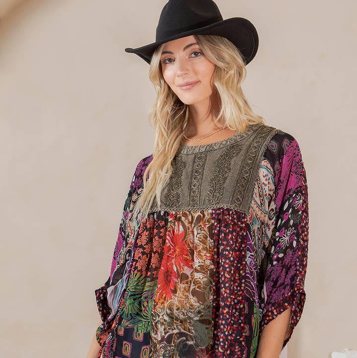 Boho denim-yoke patchwork floral tiered tunic top made from soft rayon and cotton, featuring multi-print panels, 3/4 bell sleeves, and a relaxed, flowy silhouette perfect for everyday boho style. • Style: Boho patchwork tiered tunic with denim yoke • Material: Rayon & cotton mixed fabrics • Embroidery: None • Design: Multi-print patchwork panels with a denim top yoke and flared tiered silhouette • Length: Tunic length, falls at hip to mid-thigh • Sleeves: 3/4 bell sleeves with patchwork panels • Texture: Soft, lightweight, and flowy with textured woven prints • Comfort: Relaxed, airy fit with easy movement • Occasion: Casual outings, brunch, travel, everyday boho styling • Care Instruction: Machine wash • Details: V-neck with tie strings, layered patchwork prints, denim contrast yoke, flouncy feminine drape Key Features: Unique mix of denim and multi-print patchwork Flowy tiered silhouette with roomy comfort Soft rayon & cotton blend for breathable wear 3/4 bell sleeves with boho charm V-neckline with braided tie accents Bulleted Features: Denim yoke with mixed floral and stripe patchwork Tiered flared body for a breezy, feminine look Soft rayon–cotton blend ensures breathable comfort V-neck with decorative ties 3/4 wide bell sleeves with contrast prints Perfect for casual and travel-friendly styling Perfect for Spring Summer 2026 and Beyond. Western Flair for Everyday. Spring Summer 2026 New Arrivals! 🎉 Why Preorder? * Be the first to own this must-have piece * Limited stock available—secure yours before it sells out! * Exclusive preorder discounts Disclaimer: Due to the unique nature of patchwork design, each product will be unique.