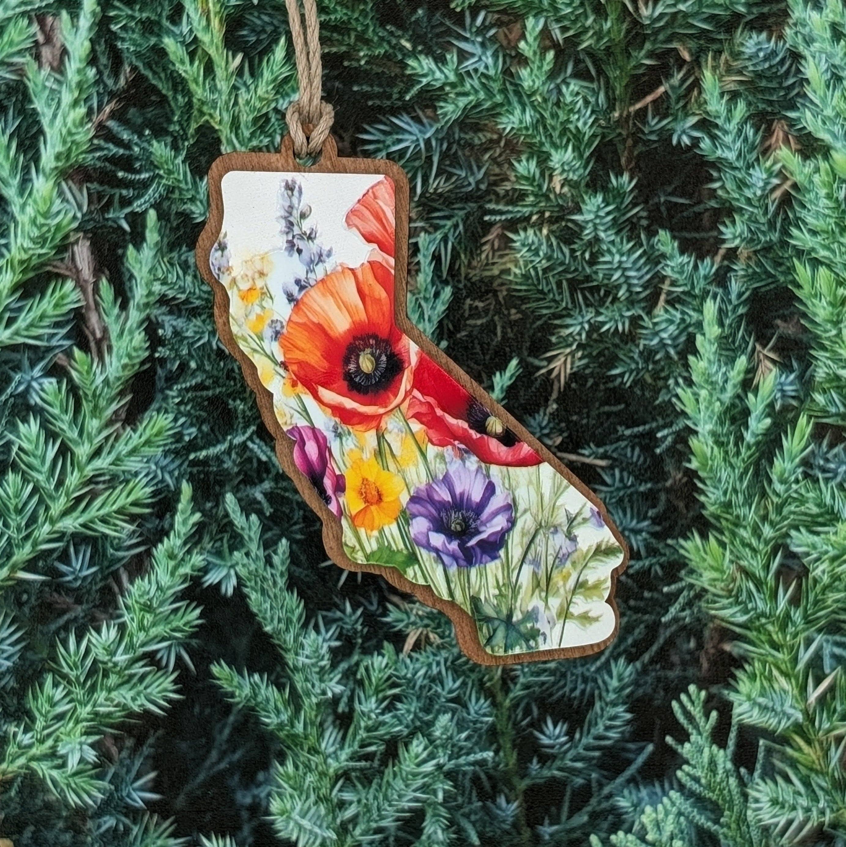 Celebrate the sunshine and adventure of California with this state-shaped ornament! Featuring the state name inside its outline, this keepsake is perfect for beach lovers, Hollywood dreamers, and anyone who holds California close to their heart. Whether it’s the Pacific Coast, wine country, or city vibes, this ornament adds a touch of West Coast charm to your holiday decor. Order now to bring California love to your Christmas tree! Product Details: Materials- Birchwood Size- 3" x 3.5" and 0.35” thick It comes with a string for hanging Please note: Due to the one-of-a-kind nature of the medium, exact colors and patterns may vary slightly from the image shown.