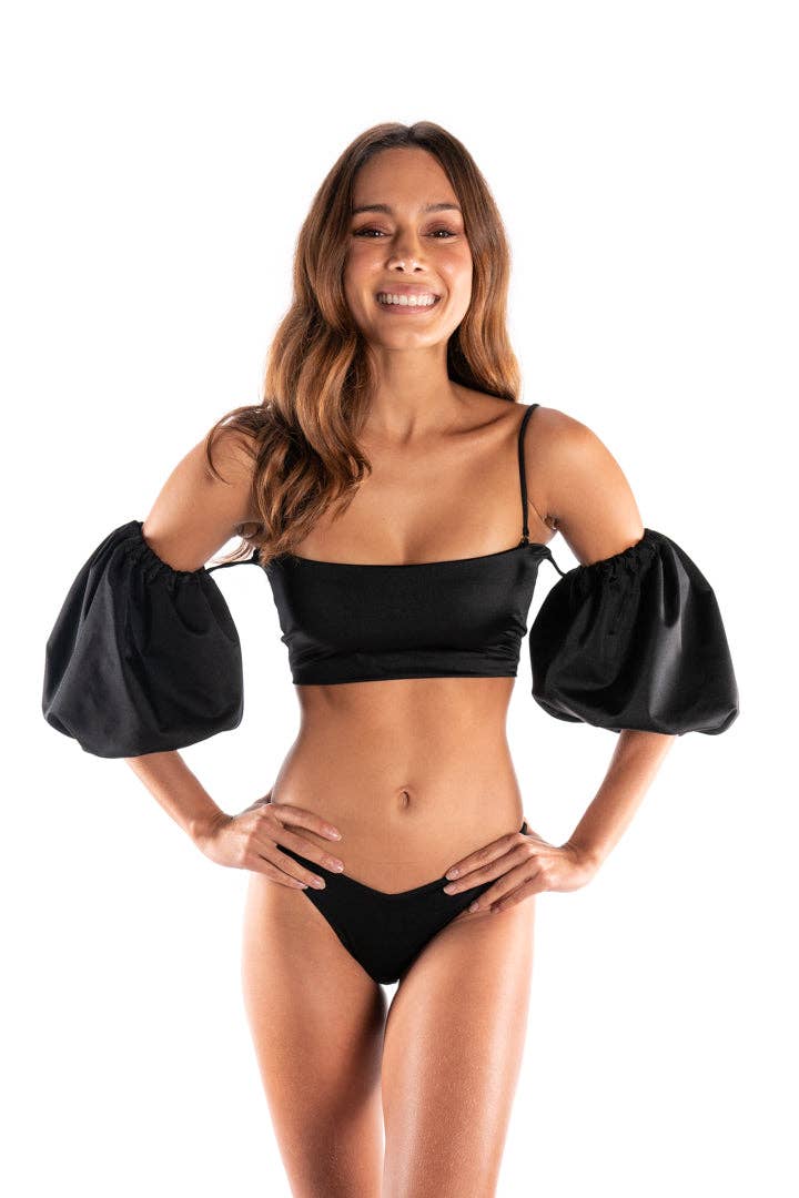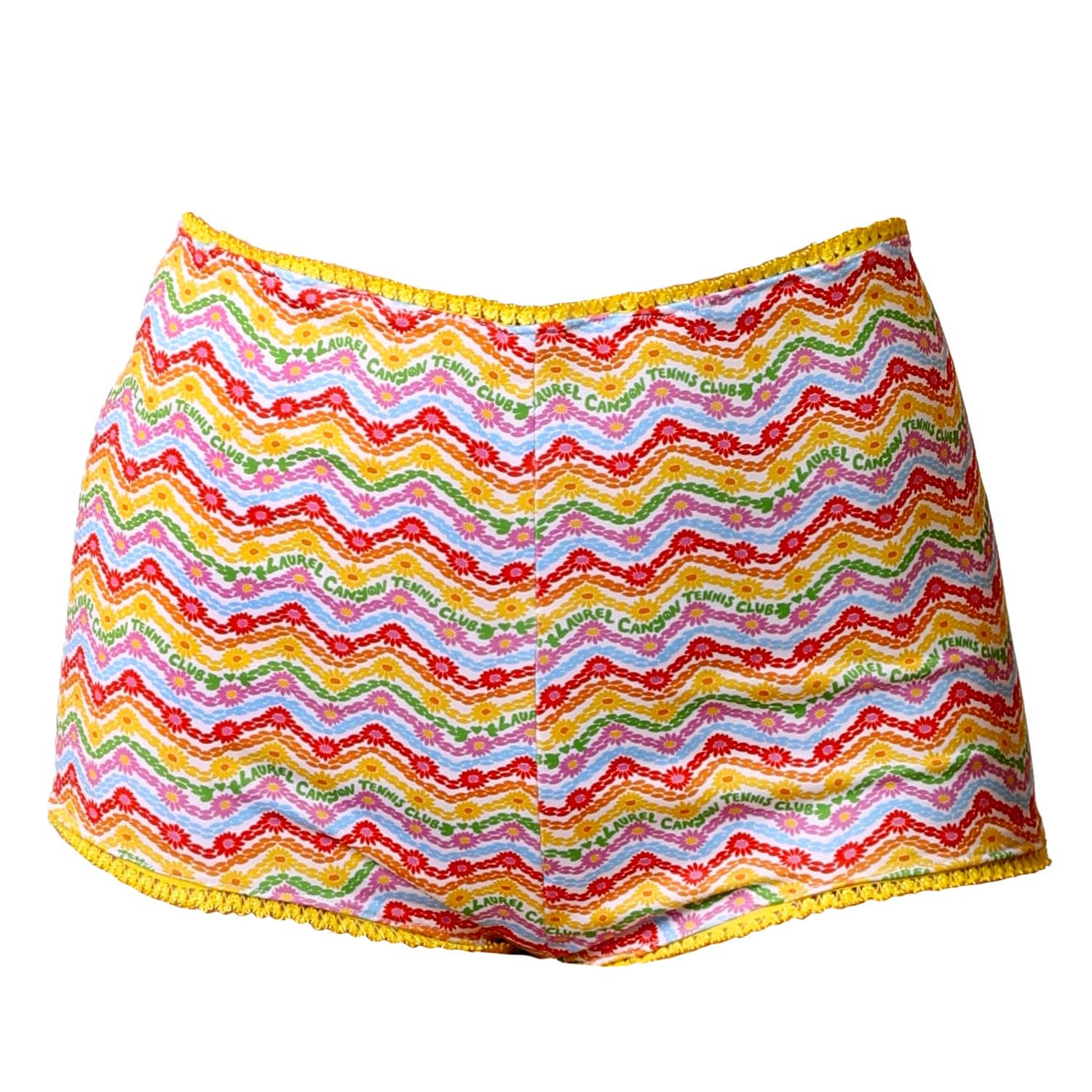 Turn heads with our Tennis Bikini Bottoms, our sexy updated take on vintage tennis underwear. Featuring our Melty Racquet floral print on soft luxury stretch fabric made with 88% recycled materials. Trimmed with sunny yellow lace, these high waisted tennis bikini bottoms are short on the court and cool in the pool. We've tested them during match play and find that keeping a tennis ball under the side is great for distracting your opponent! * Designed, printed and sewn in California * Sustainable, small-batch local production * Moisture-wicking luxury stretch fabric made with 88% Recycled Poly (made from recycled water bottles) and 12% Spandex * SPF 50 UVA/UVB Protection * Lace trim * Vintage-inspired high waisted cut with moderate coverage * Muse Micaela is wearing size Small * Muse Fox is wearing size X-Small Wear them alone with our Melty Racquet Tennis Bikini Bralette or Sports Bra or under our Melty Racquet Tennis Dress or Wrap Skirt.