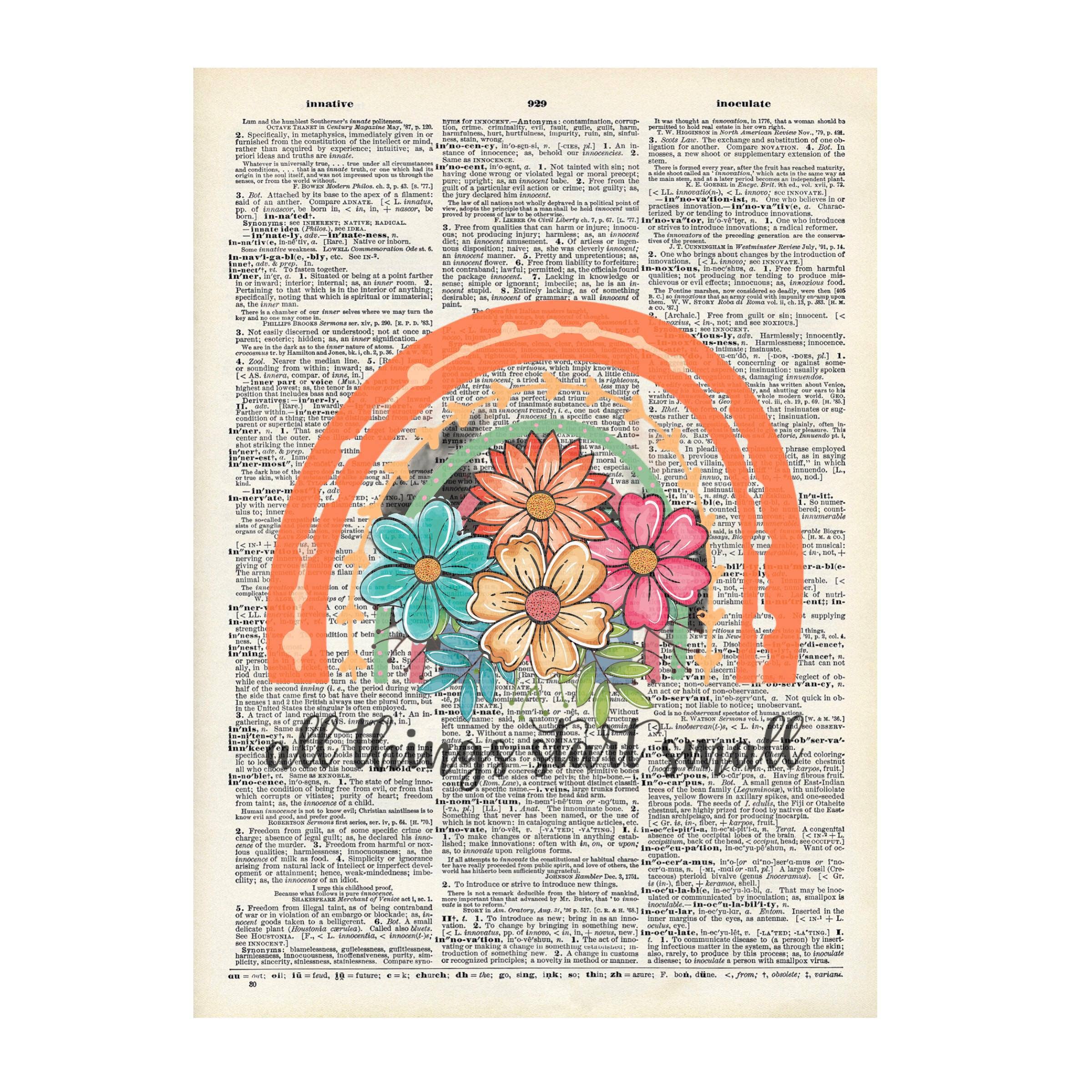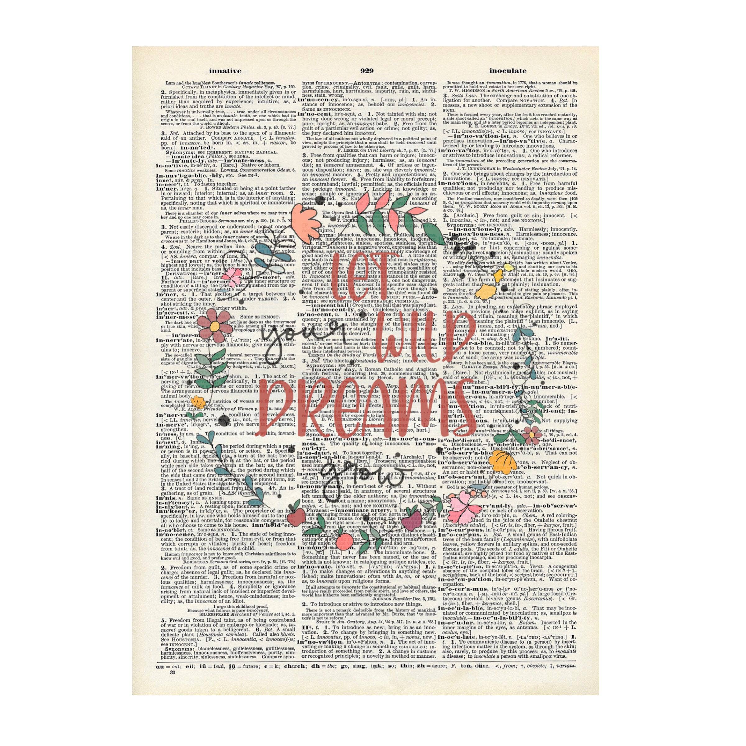 Introducing our beautiful collection of Vintage Dictionary Prints! Each print is meticulously crafted using recycled pages from vintage dictionaries, adding a touch of history to your home decor. Delight in the unique and charming illustrations that adorn these prints, capturing the essence of a bygone era. With their timeless appeal, these prints are perfect for adding character to any space, from your living room to your office. Discover the beauty and nostalgia of vintage art with our recycled dictionary prints today! Fits great in a 8x10 frame