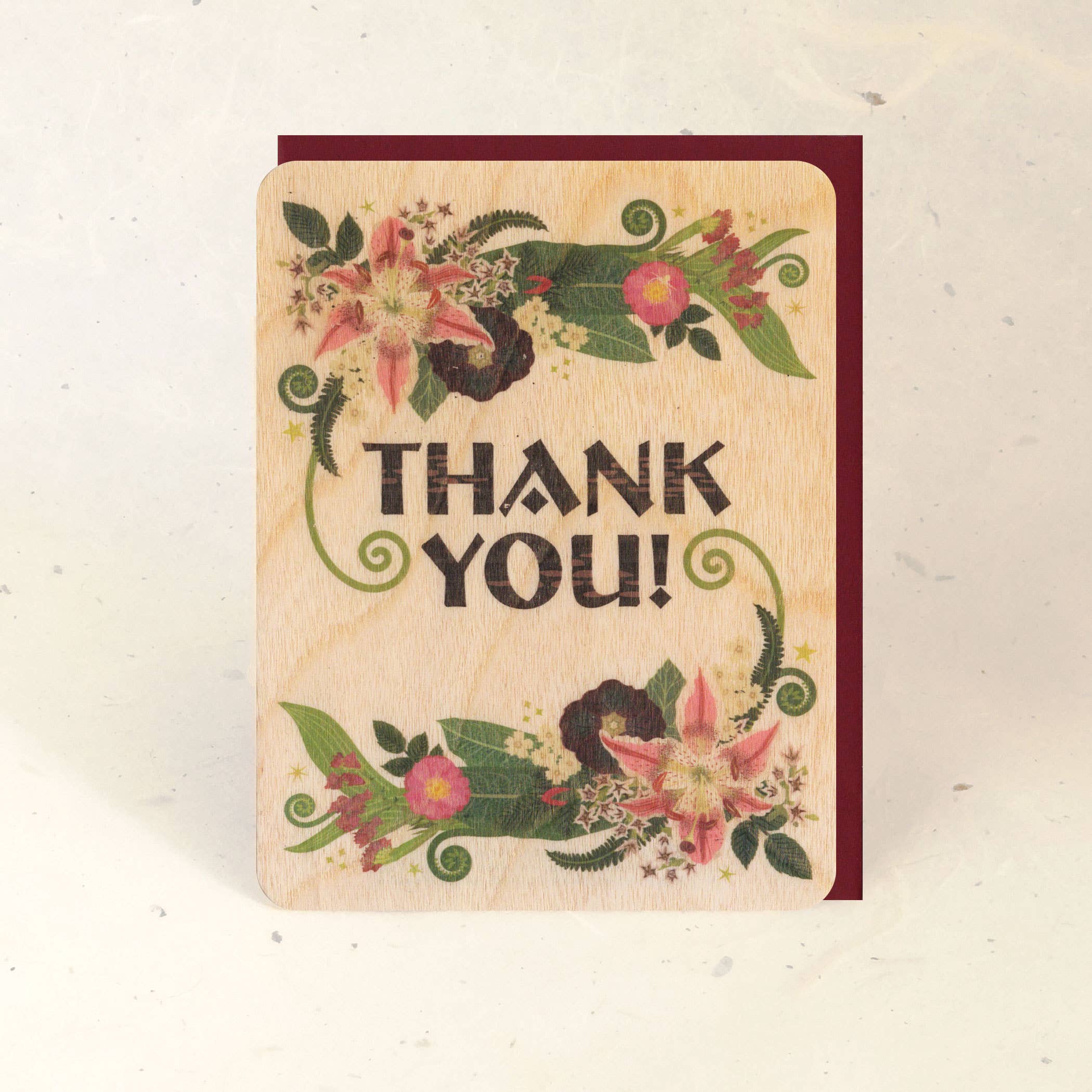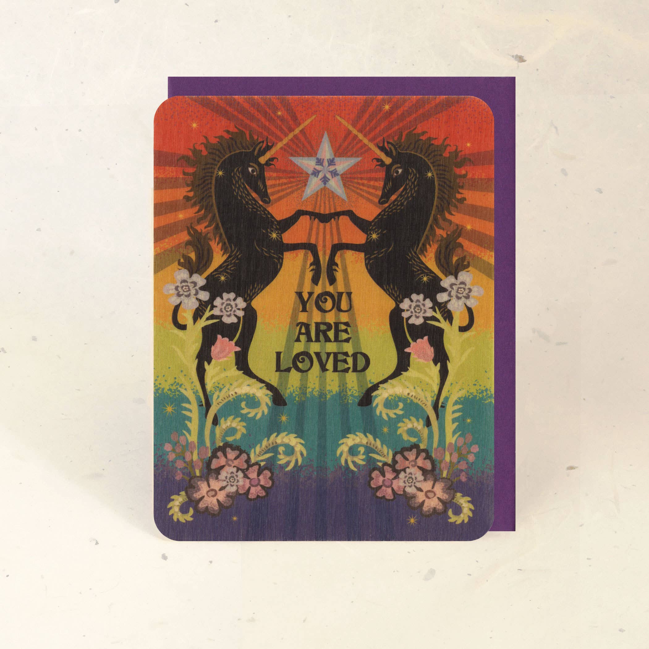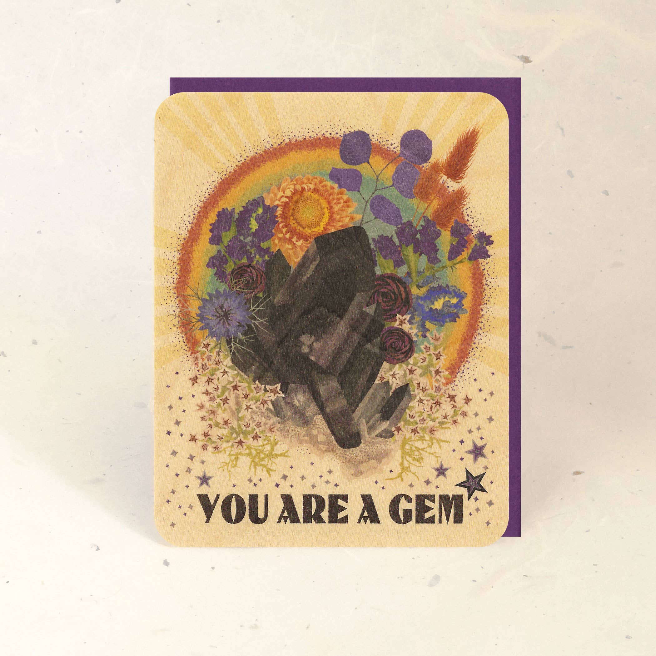 This is an original illustration printed on real wood veneer, which feels good in the hand and catches the eye with subtle textures, warm colors, and patterns of light. Each piece of wood gives the design a unique character; the complexity of the grain brings the art to life. Wood veneer is very sturdy and flexible so it holds up to the test of time – beautiful & practical – worth keeping or even framing. DETAILS: • design is colorfast laser-printed • printed on a flat, thin, and flexible sustainably-harvested 2-ply veneer • 4.25 x 5.5 inches with rounded corners • 100% recycled envelope included • back side of the card is blank except for a small logo and instructions • can easily be written on with a ballpoint pen, gel pen, or pencil • 100% biodegradable The card comes enclosed in a 100% plant-based biodegradable sleeve and has an informative card with logo, company info, sustainability info, and writing recommendations tucked in the back.