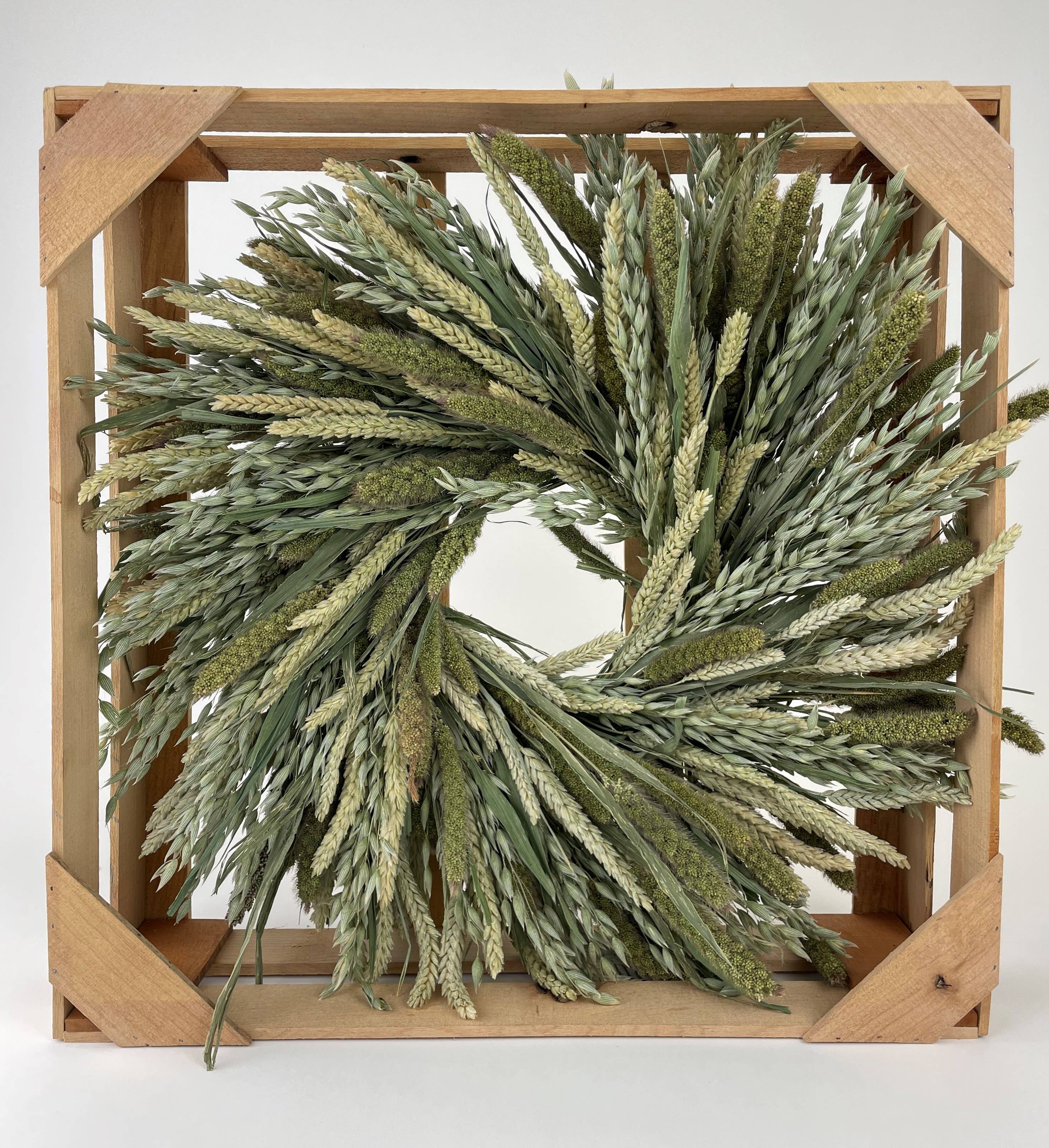 Handcrafted in our California studio, this 18" wreath is made of dried wheat grown in Arizona. - Made of natural dried wheat - Handcrafted in California - 18" diameter x 4" depth - Please note that our wreaths are handmade of natural materials that can be damaged if exposed to rain, snow, or heavy wind. We recommend keeping our wreaths inside or on a covered porch to protect the wreath. - Ships separately from our other items in a store-able wreath box.