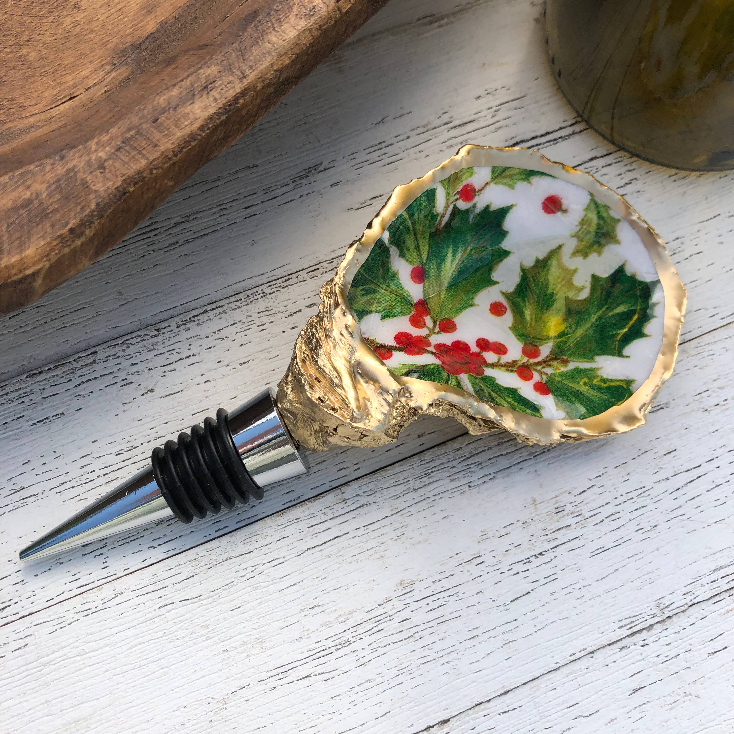 Add a touch of coastal elegance to your home with these handmade decoupage oyster wine stoppers! These wine stoppers, shown here in some of our Christmas designs make the perfect gift for anyone or the perfect accessory to any holiday decor. This piece, suitable for any occasion, seamlessly blends into your decor, enhancing the aesthetics of your space. Handcrafted in Hilton Head Island, South Carolina. Add this unique piece to your collection today!