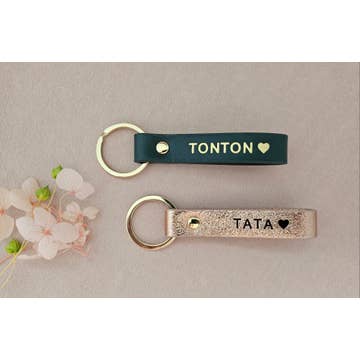 - Personalized leather keychain; - waxed edges and double-sided leather; - hot-stamped with gold leaf (except black ink); - made in France; - ideal for family gift, Christmas gift, birth announcement.