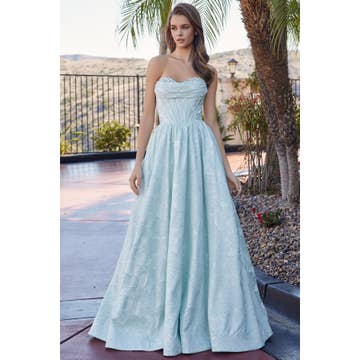 LONG SHINY TAFETTA A-LINE GOWN WITH SLIT AND LACE BACK CORSET