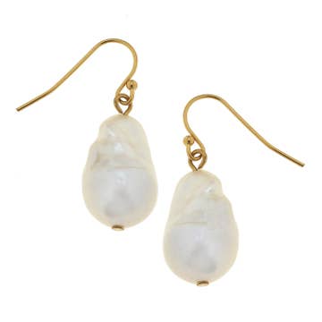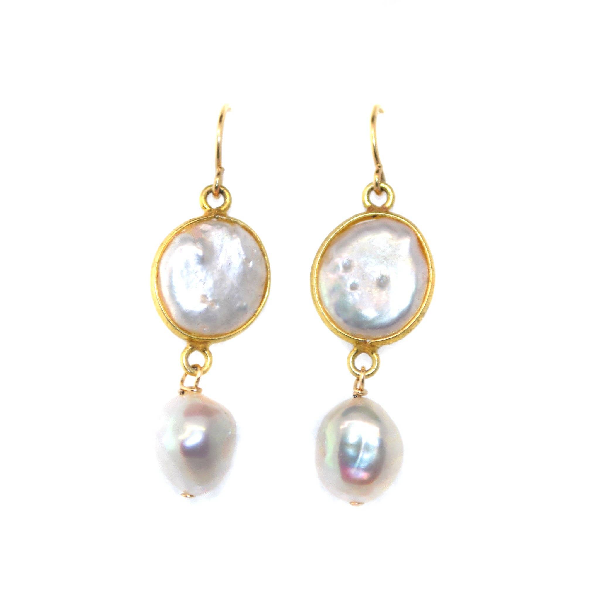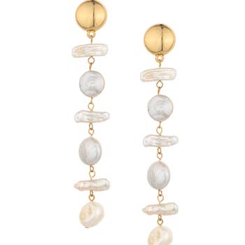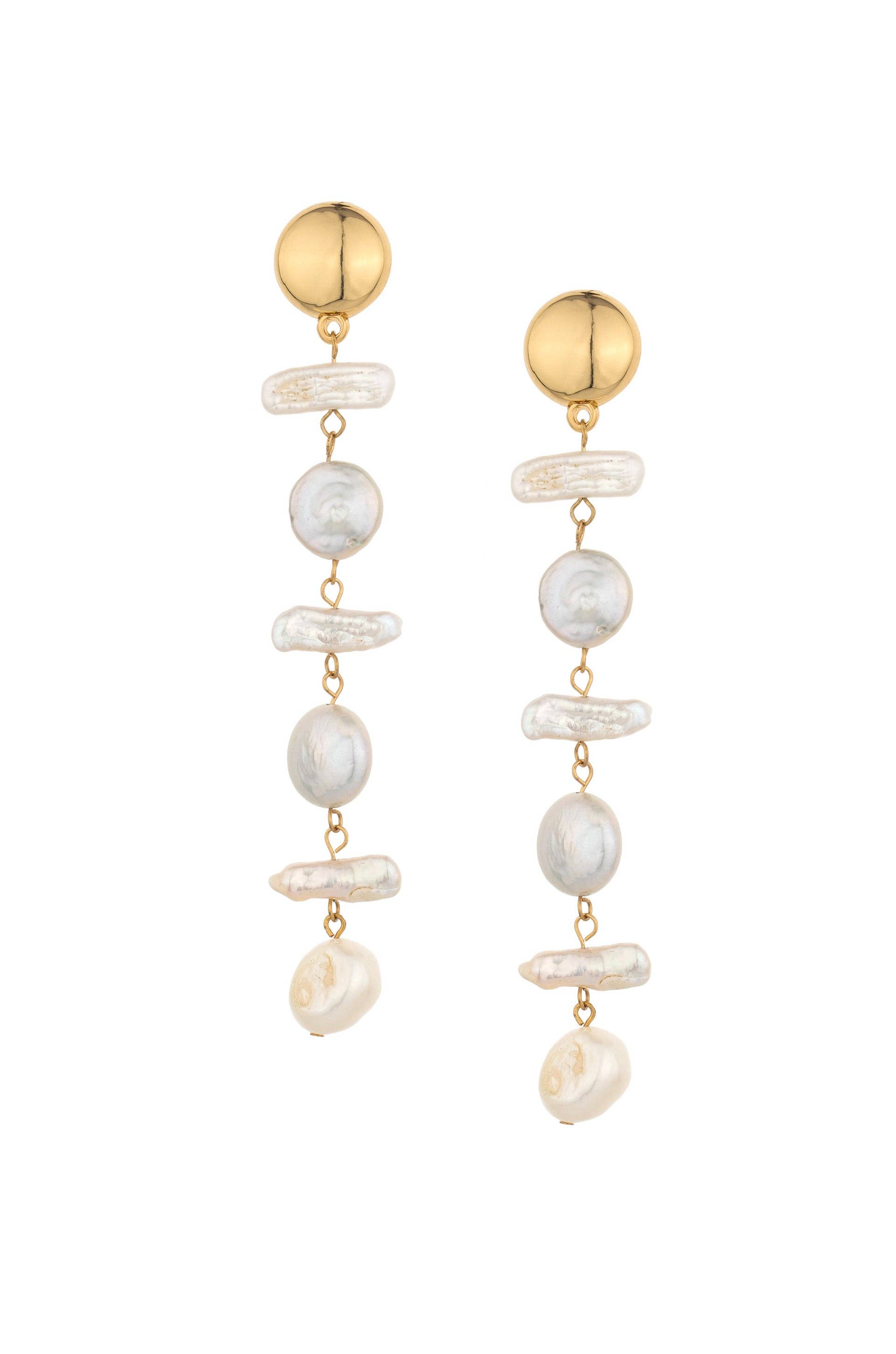 Inspired by daydreaming while gazing at the clouds, the overcast cascade earrings feature freshwater biwa pearls; each with a unique shape floating on a gold plated cable chain with a handmade gold-filled earring wire. Length 3 1/4" Width 1/2" This piece is handmade-to-order. Each piece will vary slightly due to the uniqueness of the stones. All metal is nickel free. Material: keshi pearls, brass, gold fill.