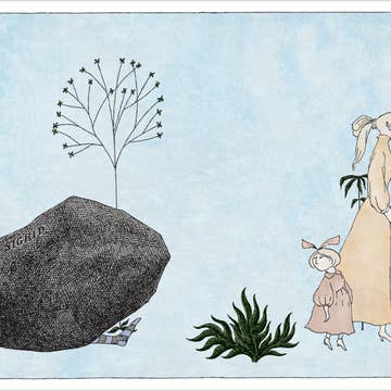 A gloss-laminate postcard, 4 x 6 inches. Features an illustration of a flower funeral by Ernst Kreidolf, circa 1922. From the 50 Watts collection.