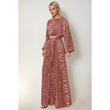FP11579-P1355 Stripe print pull on pants. Model is 5'10" and wearing size Small. - Wide legs - Smocked waistband with a drawstring fastening - Pull on design - Side pockets - Unlined - Mathcing top: FT11245-P1355. Shell: 100% Polyester Lining: None