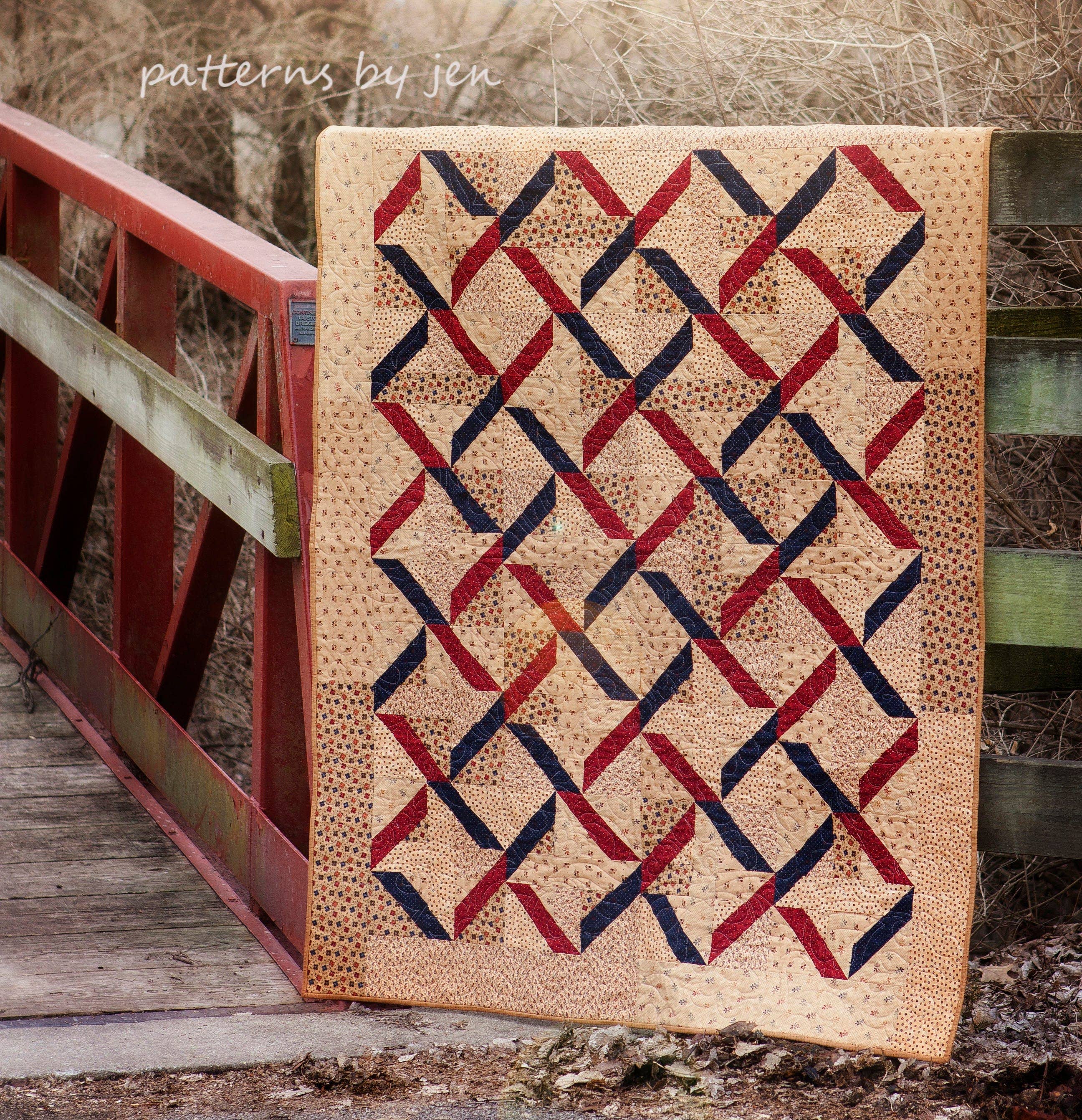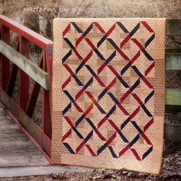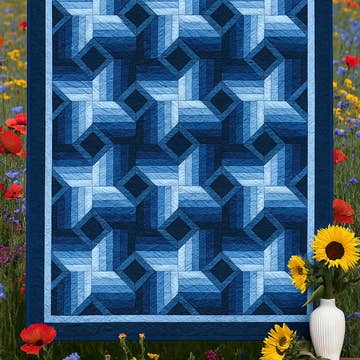 The Lady Liberty Quilt is not the traditional sampler quilt. It is a celestial masterpiece in red, white, and blue batiks (the sample is made with Island Batik fabrics). The finished quilt measures 96" x 96". 12-month block series. Each month there is a new block to make and instead of making one, you will make several of the same blocks. The blocks in this quilt are all created with straight-line piecing. This quilt can be made by a confident beginner. The pattern suggests using "The Goddess Tool" to quickly and easily create corner cut-aways, half-square triangles, tall triangles, and half-tall triangles.