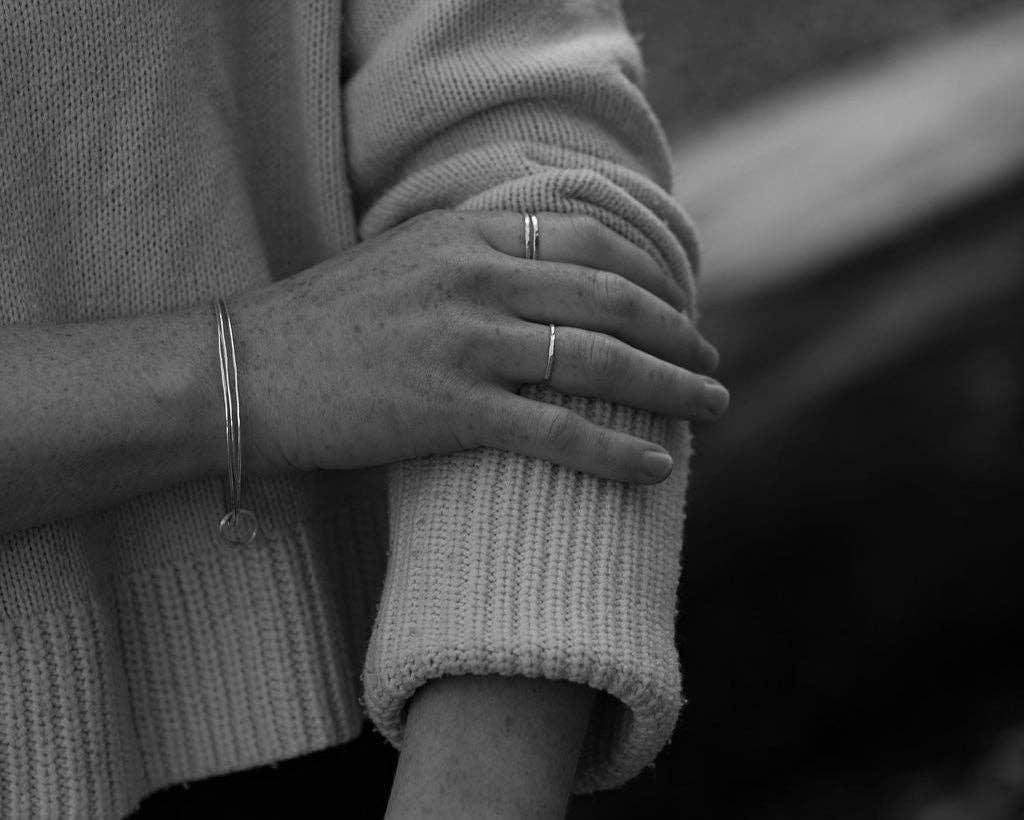 We love putting silver and brass together and this stacking bangle works well on its own or with other bangles including our very own chunky Durgan bangle. It is made up of three hammered 1.3mm bangles joined by a pebble shaped loop. Customise the materials, and choose from the below options: * Silver bangles & silver clasp * 1 silver & 2 brass bangles, fixed with a silver clasp * Brass bangles & silver clasp --- Materials (depending on the variant) Recycled silver Brass Size Universal size Postage & packaging Comes with organic cotton drawstring bag