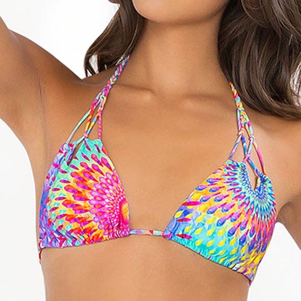 A fan favorite triangle bikini top. You can never have too many triangle tops. You will get the perfect tan all the way around. Featured in our Funfetti fabric with the Lime fabric on the reverse side. They pair well with the Funfetti & Lime BUOY Bottoms. Available in sizes XS-XL. All of our tops and bottoms are reversible which means you get 2-4 suits out of each pair. Details This style runs true to size. Bella is 5'5" wearing a size small. Funfetti: 82% Nylon & 18% Spandex Lime: 82% Nylon & 18% Spandex Bella Rea Swim Bikini Care: * Hand wash ONLY * Do not bleach * Do not iron * Avoid contact with rough surfaces * Wash bikini immediately after using in pools with fresh water or mild detergent