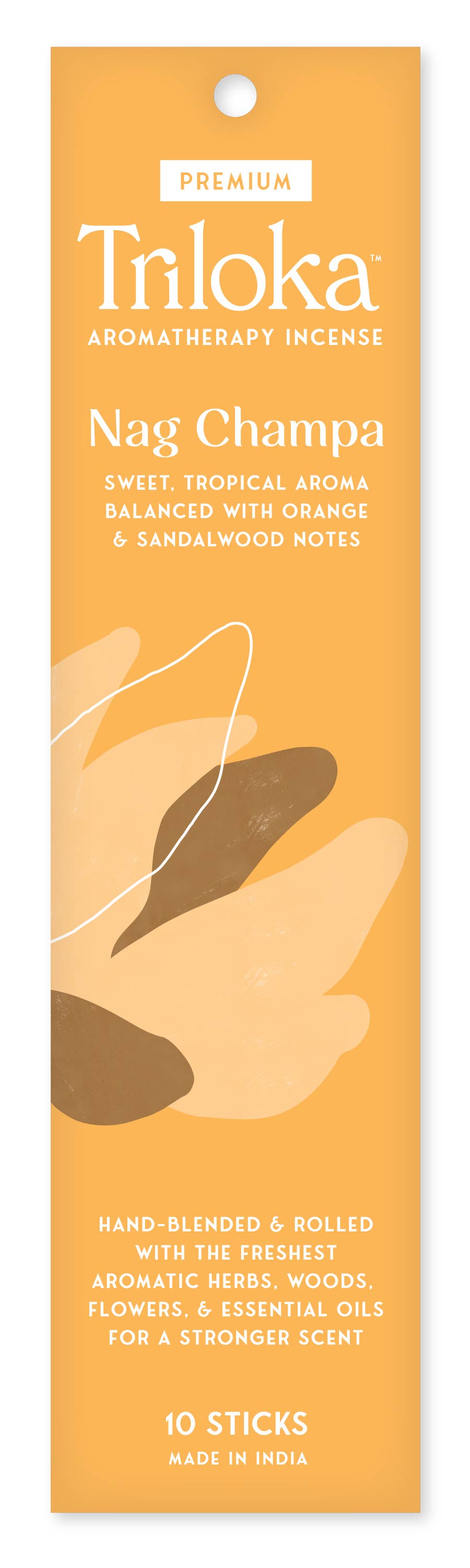 Triloka Nag Champa Premium Incense offers an uplifting and invigorating aroma that brightens the senses and refreshes the atmosphere. The sweet, floral fragrance of Nag Champa unfolds with a sense of tropical vibrancy, balanced by a delicate orange note that adds warmth and freshness. Handcrafted in India using the traditional masala method passed down through generations of incense-making families, this incense is made by blending aromatic herbs, woods, flowers, and essential oils into a rich paste, then hand-rolled onto fine bamboo sticks and sun-dried. The result is a beautifully balanced, long-lasting fragrance that gently lingers even after the incense has burned out. Each pack contains 10 sticks, thoughtfully made by our trusted supply partners. An authentic incense experience, perfect for daily rituals or moments of relaxation.
