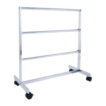 Heavy-duty, high-capacity Rolling Z-Rack is ideal for moving garments, restocking, special sales or as a movable coat rack. Black Z Rack nest tightly to save space when not in use. The Professional Z rack includes heavy duty black base and 2 locking and 2 non-locking casters. Functions as a rolling clothing rack or as a stationary store fixture. Black heavy-duty base with chrome rails. Weight capacity is 330 pounds.