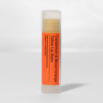 Blood Orange Cardamom Tallow Lip Balm Size: 0.15 oz tube With fragrance notes reminiscent of a mango lassi, this ultra-hydrating lip balm combines zesty blood orange and warm cardamom spice in a nourishing tallow base. Handcrafted with suet tallow from regeneratively raised Northern California cattle, each balm is enriched with the soothing powers of organic calendula CO₂ extract, locally sourced raw beeswax, and truly extra virgin Séka Hills olive oil for lasting moisture and protection. Our tallow lip balms are unwhipped to preserve nutrient density, delivering concentrated hydration without fillers. Perfect for dry or chapped lips, this balm provides smooth glide, deep conditioning, and a naturally restorative lip care experience. Ingredients: Suet tallow, organic calendula CO₂ extract, Séka Hills extra virgin olive oil, raw beeswax, natural essential oils of blood orange and cardamom.