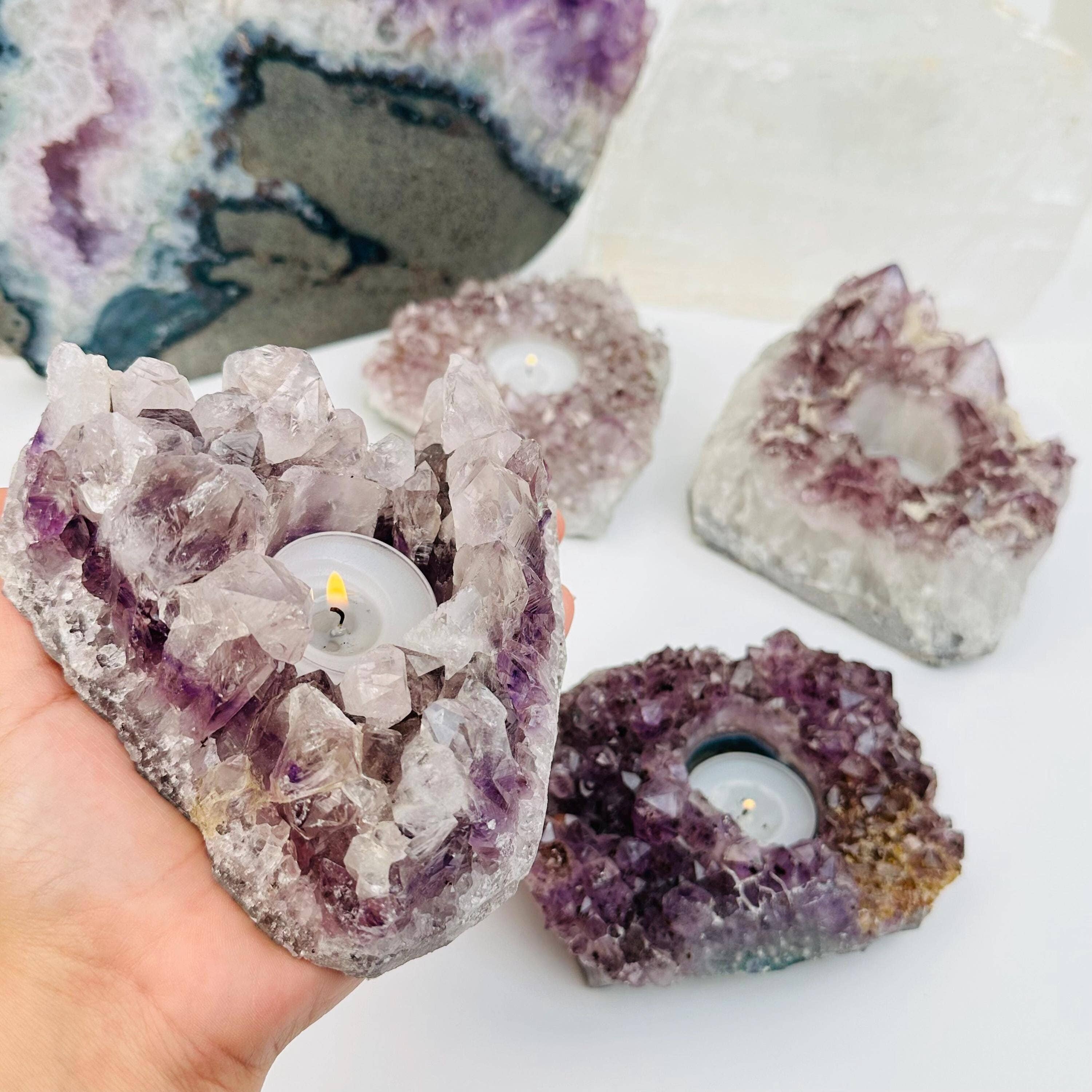 Crystal This listing is for ONE (1) Selenite Candle Holder (HW4-3LOG) The measurement of this candle holder is approx.: 7.50" X 3.25" X 1.75 CANDLES NOT INCLUDED. These would look great as home decor, a succulent, or even a gift! Follow us on Instagram @_Rockparadise_ to stay up to date Thank you and have an amazing day!!