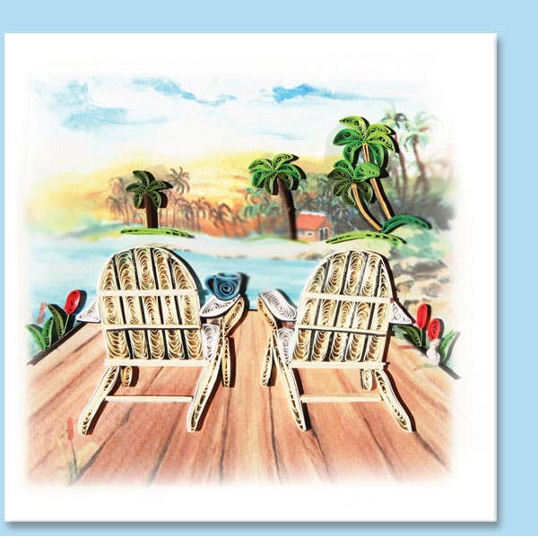 Experience the artistry of Iconic Quilling with our #718 Beach Chairs card. This hand-rolled paper greeting card measures a standard 5"x7", making it ideal for any occasion. Co-owners Aaron and Anh discovered quilling in Vietnam and founded their business to spread joy through these intricate, vibrant designs. Our cards come without any specific attributes, allowing you to personalize your message for the recipient. Enjoy the smile you'll bring to someone's day with this beautiful piece of art.