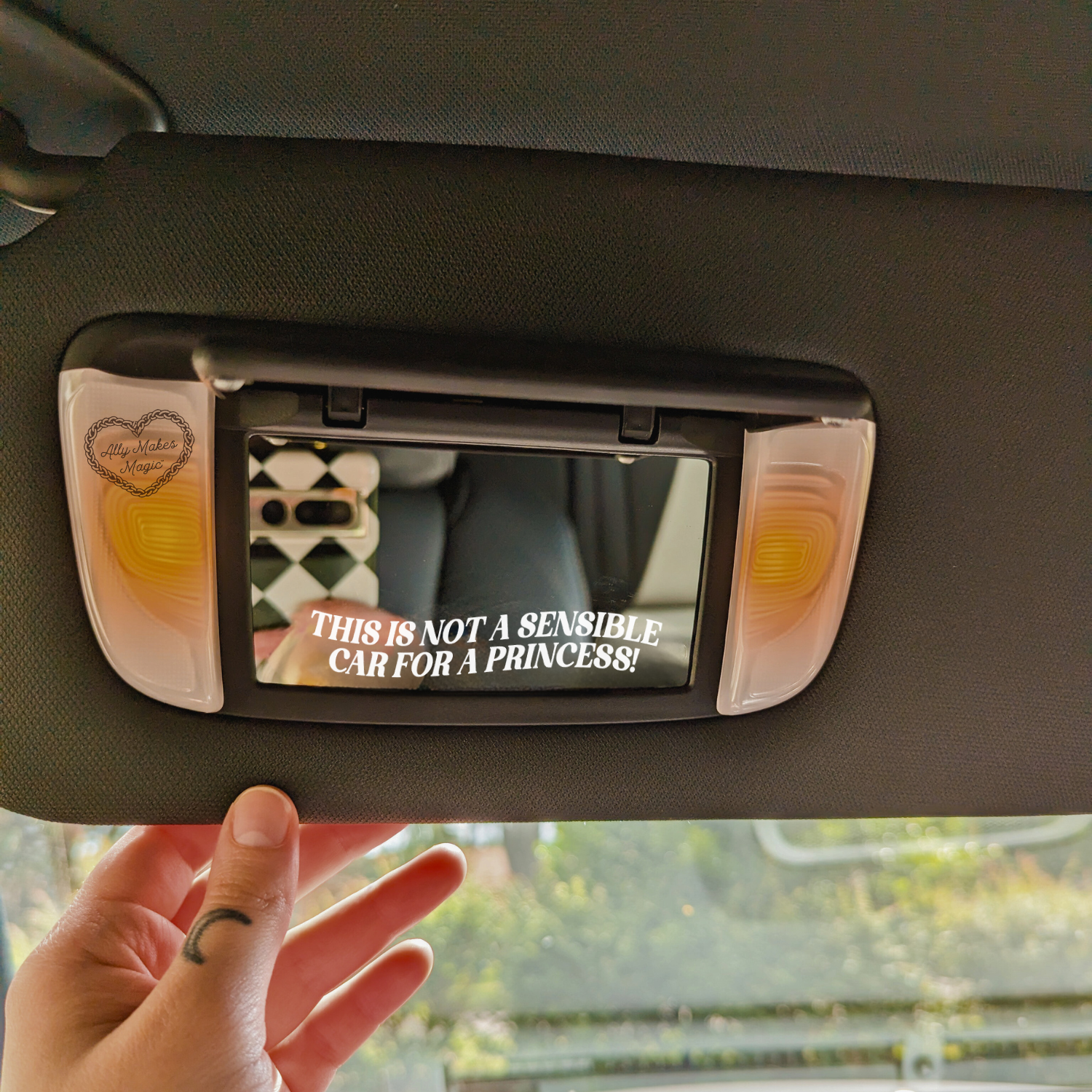 - approx 4" wide - clear background + border - 4 color options! - Sticker style is best for laptops/water bottles/car exterior mirrors & windows. Will leave a slight residue when removed and cannot be re-used. - Static cling style is best for car interior (rearview mirror, sun visor mirrors) and windows. These do not leave a residue when removed and can be re-used!