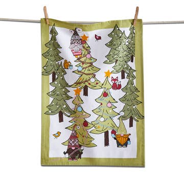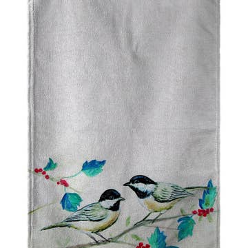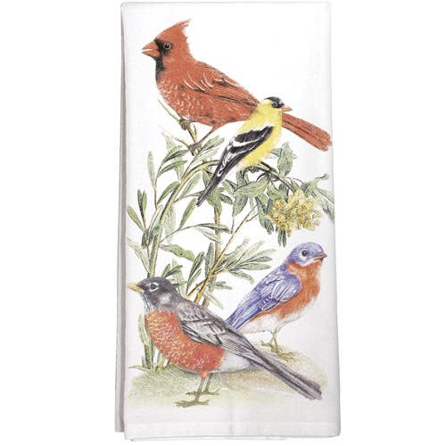 Ginger Bird Tea Towel Add a festive touch to your kitchen with our "Ginger Bird Tea Towel." Featuring a delightful scene of colorful birds gathered around charming gingerbread-inspired birdhouses, this tea towel is a celebration of the holiday spirit and the beauty of nature. * Material: Crafted from 100% premium cotton, ensuring superior durability and absorbency. * Size: Generously sized at 19" x 28", perfect for all your kitchen tasks and holiday baking needs. * Design: Edge-to-edge print that captures a cozy winter scene, with vibrant cardinals, finches, and other birds perched on and around intricately detailed gingerbread birdhouses, set against a serene birch tree background.