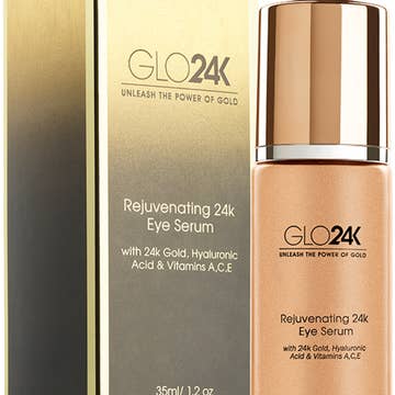 Rejuvenating 24k Eye Serum-with 24k Gold, Hyaluronic Acid & Rosehip Oil GLO24K Eye Serum is a rich, silky formula developed specifically to deliver immediate, visible results to the delicate skin around the eyes. Enriched with 24k Gold, Hyaluronic Acid, Rosehip Oil, and anti-oxidant Vitamins A,C,E – all known for their age-defying properties – this Eye Serum will improve skin’s condition by reducing the visible signs of premature aging such as fine-lines, wrinkles, under eye puffiness, and crow’s feet. This Serum contains encapsulated potent golden beads that will dissolve upon contact with the skin for optimal results. For best results follow with our Eye Cream. For all skin types. Gently tap onto clean skin around the eyes. Use 2-3 times a week. Caution: Avoid contact with eyes. Keep out of reach of children. For external use only.
