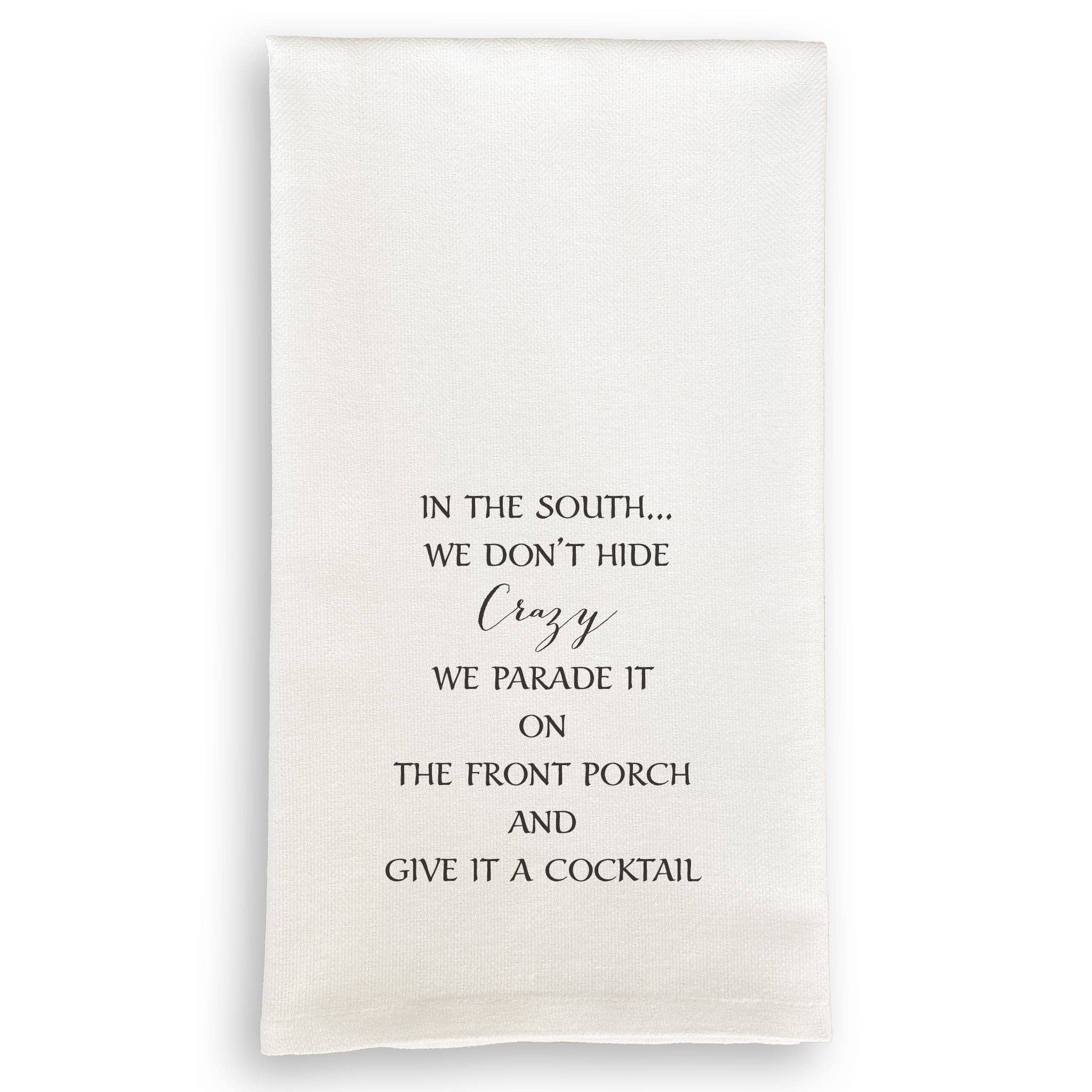 Cute Retro Tea towel, "In this family, we don't hide crazy. We put it on the porch and give it a cocktail." Great counter grab items!