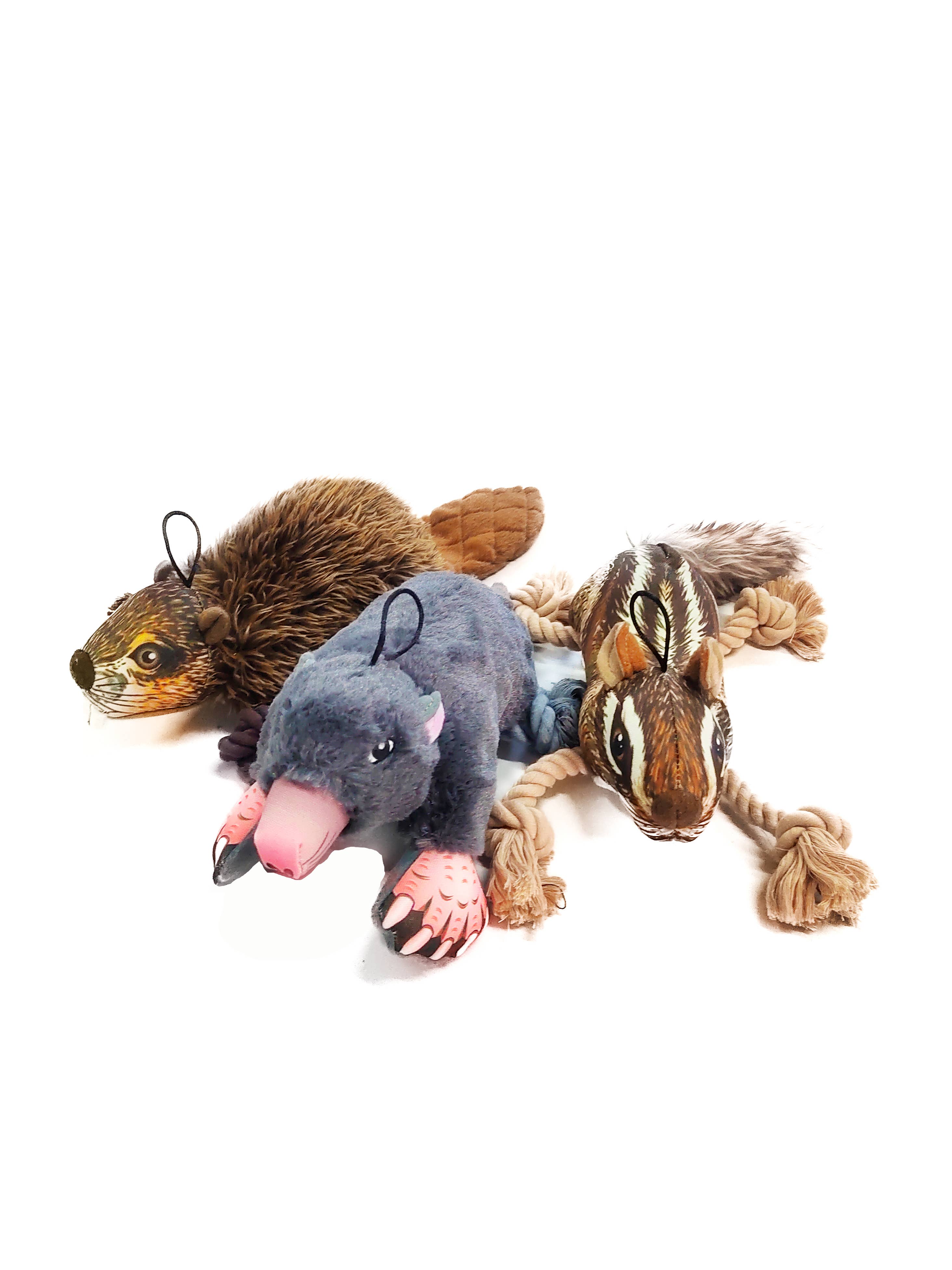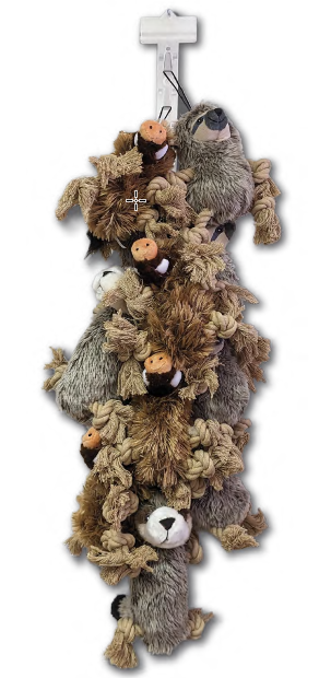 All 3 of the Realistic Ropers* are conveniently in one display! Four of each of Beaver, Chipmunk, and Mole already attached to the included clip strip, allows you to display them anywhere you can hook it. *Soft plush realistic looking plush with rope toys for hands and feet and a squeaker inside.