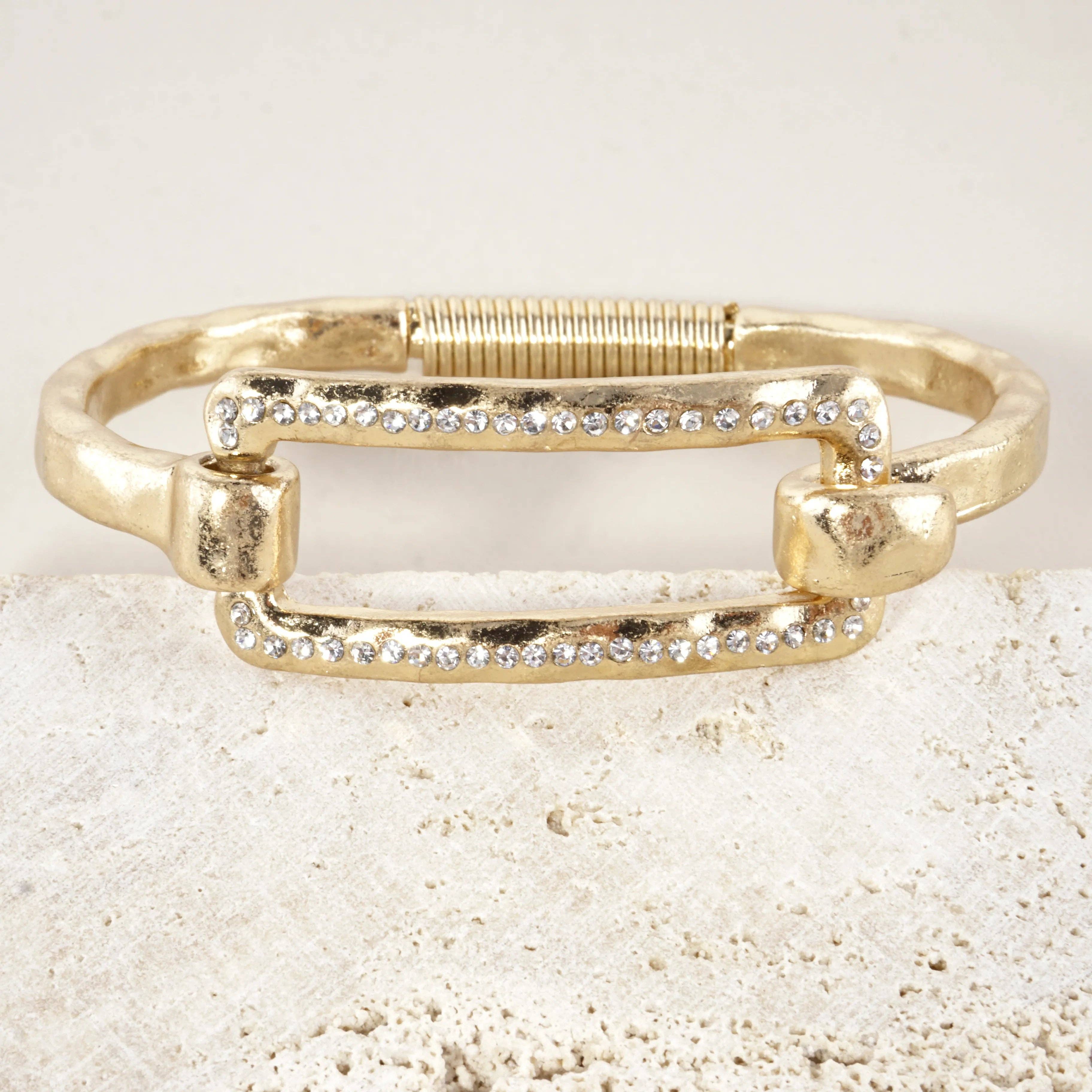 The Hammered Metal Round Hook Clasp Hinged Bracelet by Wild Honey is a unique piece. Its hammered metal design and round hook clasp add a distinct appeal. This bracelet is a stylish addition to your collection, reflecting Wild Honey's commitment to providing a wide range of fashion accessories.