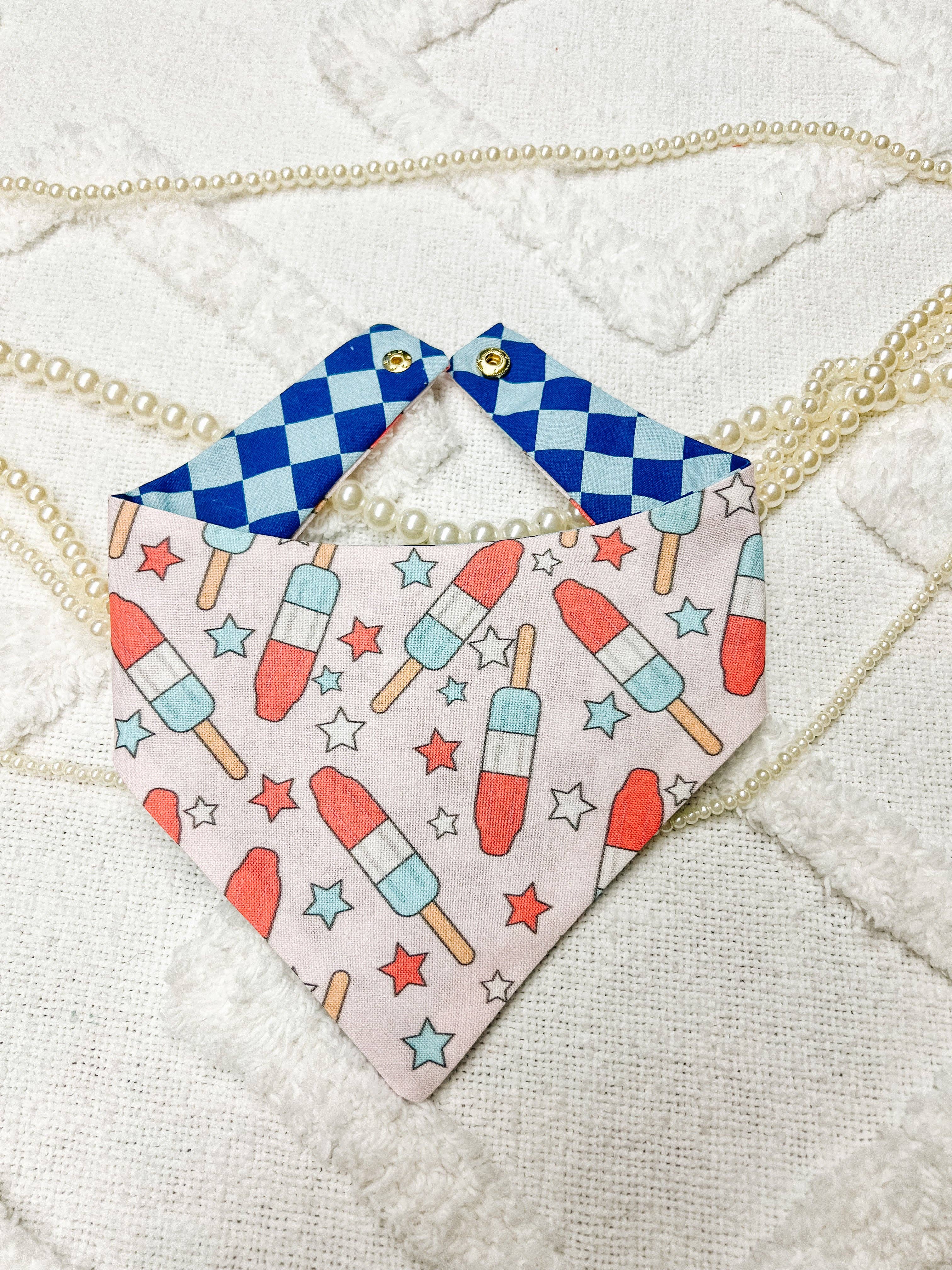 Our Over The Collar bandana comes in five sizes. It features a pocket that your dog’s collar slips through. Each bandana is handmade and measurements can vary up to ½ inch. This bandana is single sided to reduce bunching. Design may be straight across or diagonal depending on inventory. Cats generally wear a Xsmall Recommended Bandana Size Based On Collar Length Xsmall: 8" - 12" Small: 11" - 15" Medium: 15" - 18" Large: 18" - 22" Xlarge: 21" + Main listing photo is a size Medium. Prints vary, and small bandanas will feature less of the print than large bandanas. Care Instructions: -Machine wash cold -Lay flat to dry or tumble dry low -Iron and starch for extra awesome bandana power!