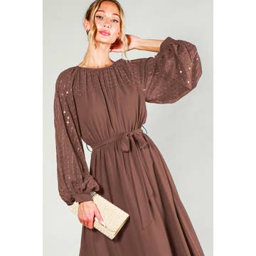 STUNNING SEQUIN MAXI DRESS FEATURING: - SEQUIN FABRICATION - LOW V NECKLINE WITH CHIFFON BINDING - ELASTIC WAISTBAND - HIDDEN SIDE ZIPPER - VOLUMINOUS SLEEVE WITH CUFFED ENDS - KEYHOLE AT BACK - SIDE SLIT DETAIL - FULLY LINED
