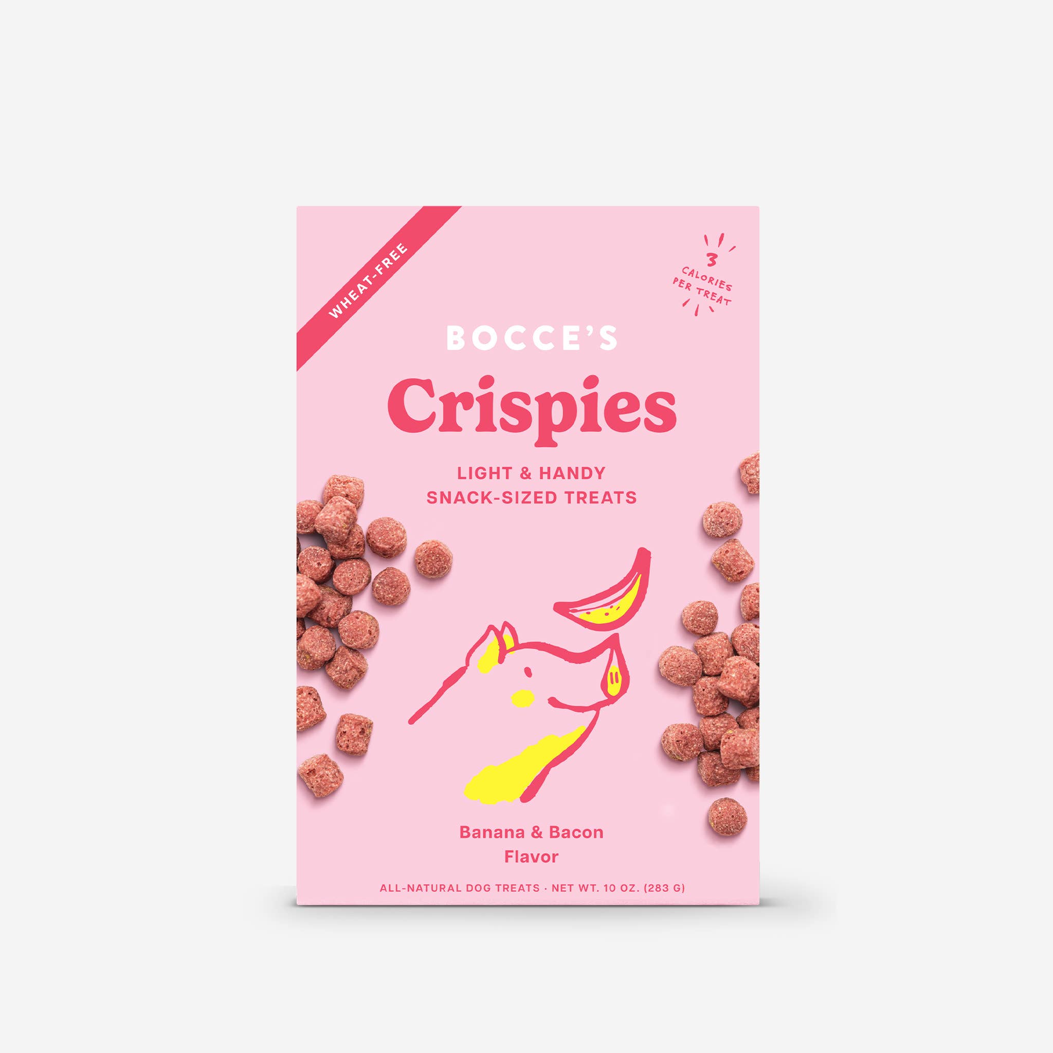 Light and handy snack-sized treats! At only 3 calories per treat, Crispies are perfect for all-day snacking & training. * 10 oz. * 100% Real Ingredients * Baked in the USA * Wheat-Free * Low-Calorie (Just 3 per treat!) Ingredients: Oats, Rice, Banana, Beet Powder, Natural Bacon Flavor, Citric Acid Guaranteed Analysis:Â Protein: 12%Â Fat: 6%Â Fiber: 10%Â Moisture: 10%Â Calories:Â 3 Cal/treat