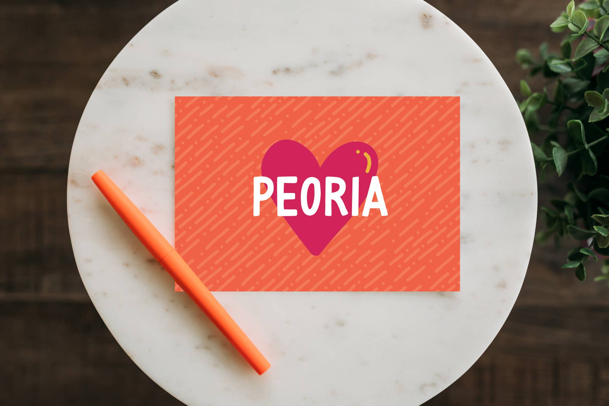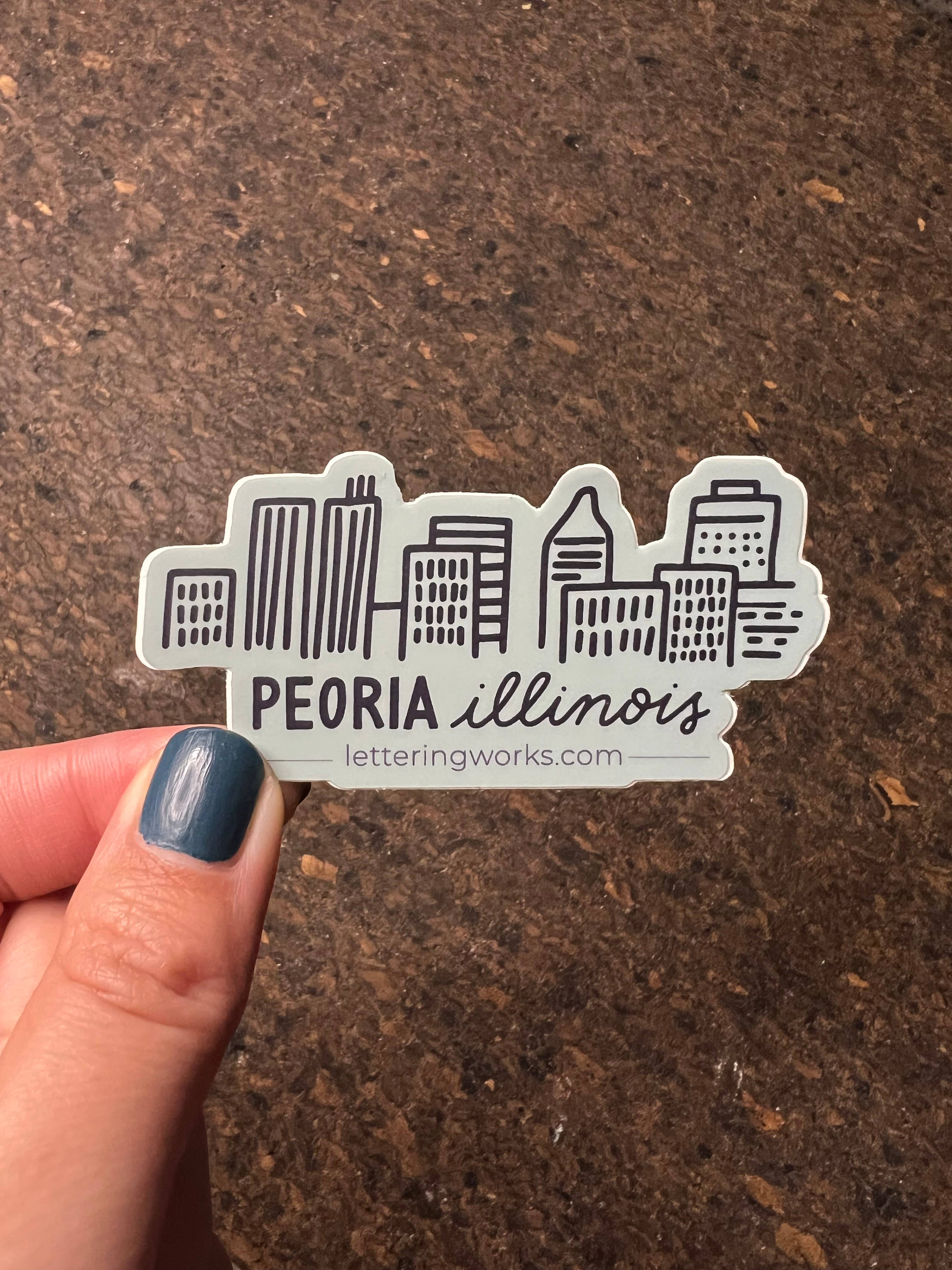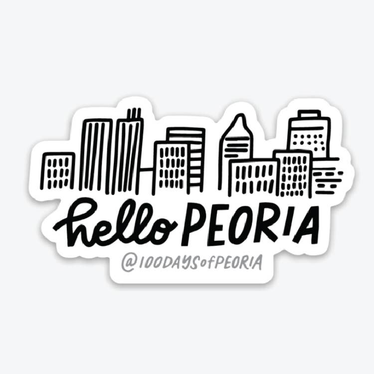 3’’ Die-cut vinyl sticker. Lettering Works was founded in Peoria, IL in 2016 by lettering artist and Bradley graduate Chelsie Tamms. Hello Peoria was started by a group of passionate advocates for the community and has since grown into a popular hashtag to share happenings throughout the community, especially those within the art community. This sticker celebrates the Hello Peoria movement and creativity that Peoria has. Product Details: "Hello Peoria" Hand-Lettered Sticker • Die-cut sticker measures 3x2.31'' • Navy blue background with yellow-orange gradient lettering Note: Other Peoria designs have since been retired but are available upon request.