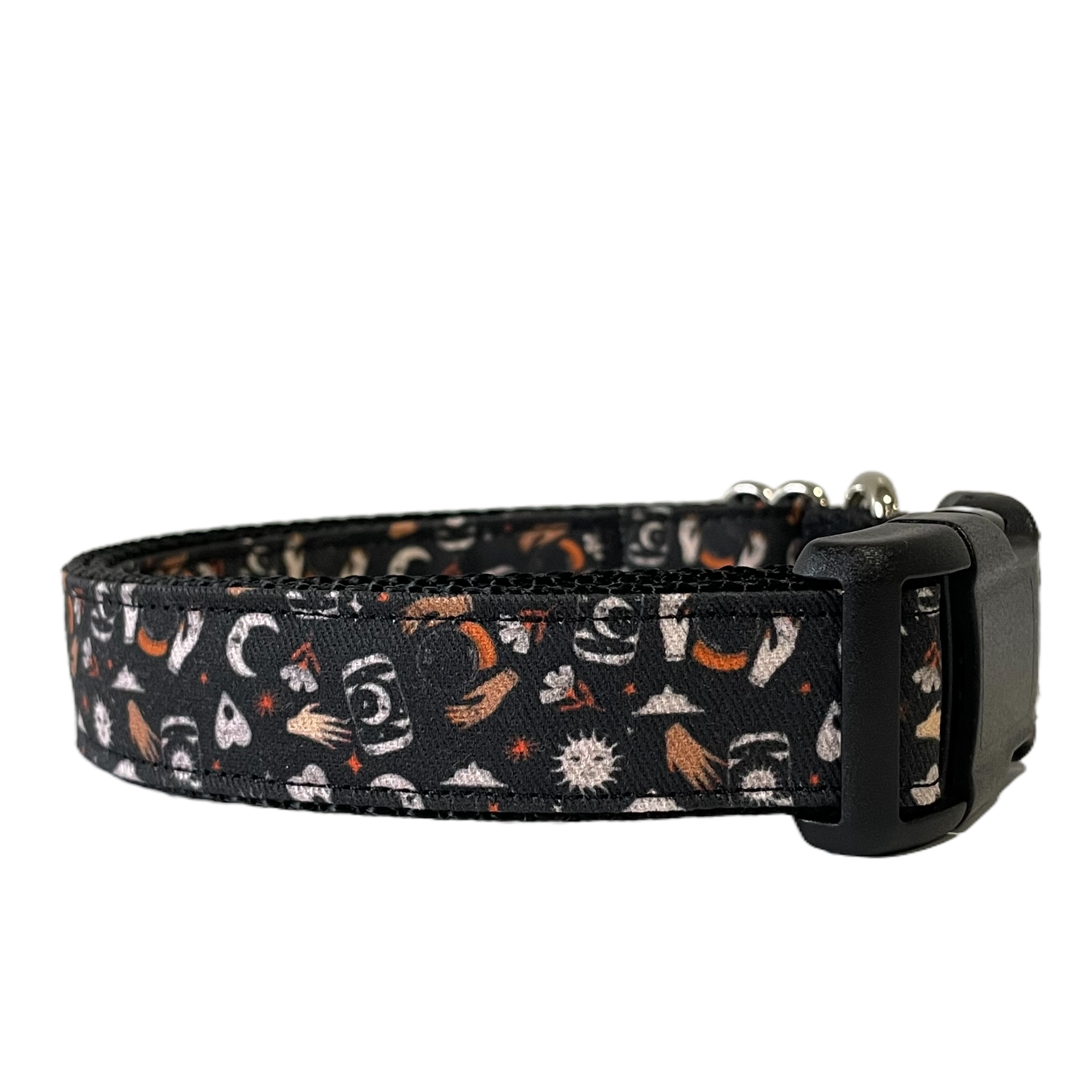 Our hand sewn collars are made with vibrant printed fabrics, sewn on heavy duty nylon webbing. All collars are adjustable with a nickel plated metal slide. All collars are finished with a nickel plated heavy duty welded D ring, sewn in beside a heavy plastic YKK brand buckle. Exact placement of each print will vary as all products are cut from fabric, ironed and sewn. Each is unique in their own way!