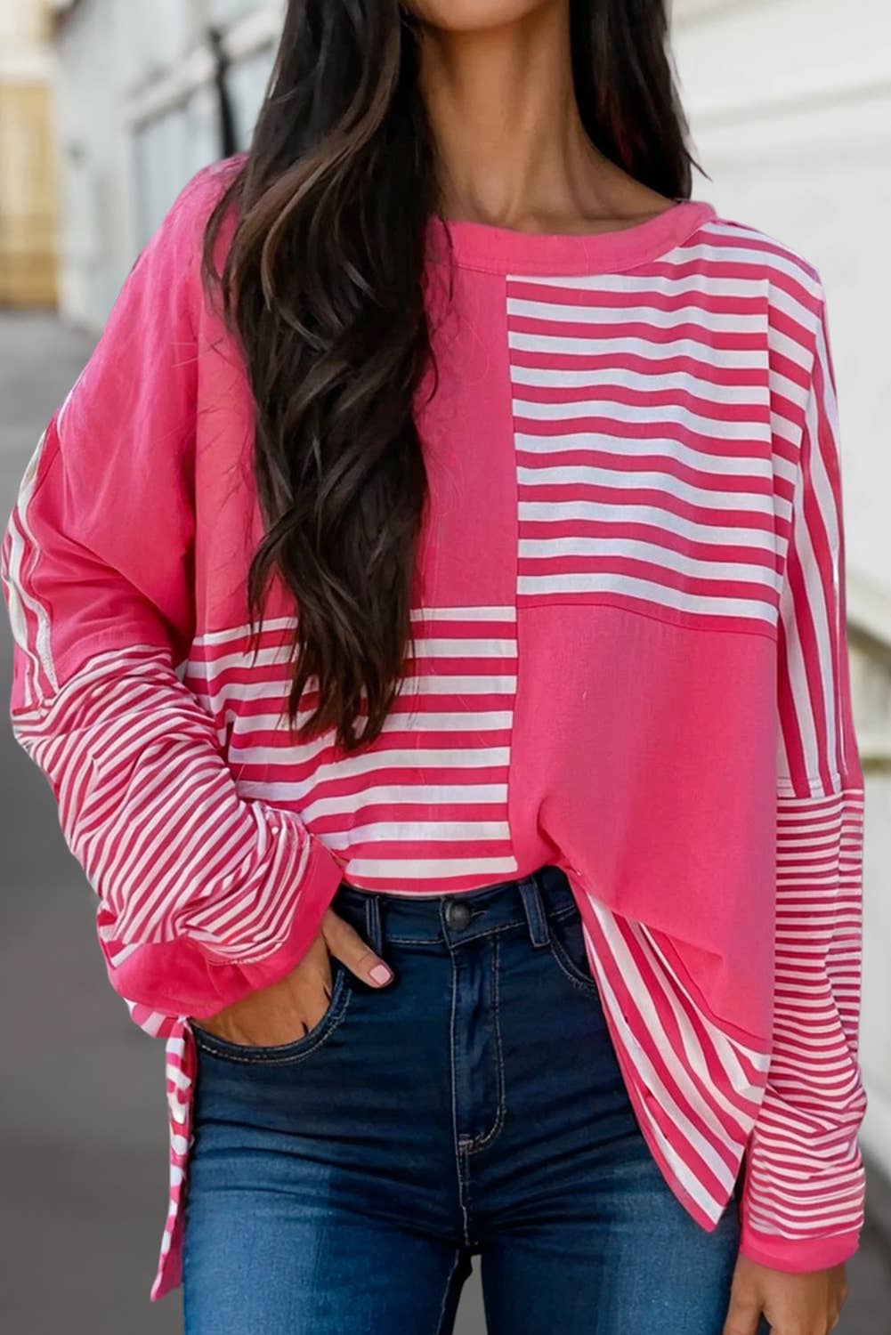 Pink Stripe Colorblock Drop Sleeve Loose Top for wholesale on Faire3