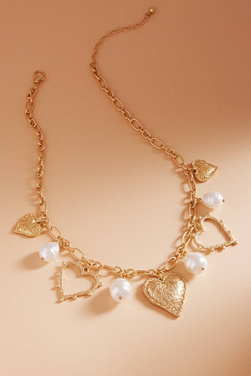 Charm Necklace, featuring Ceramic Porcelain Heart, lustrous Pearl, a blend of vintage charm with timeless designs. This unique piece adds a touch of romance and sophistication, making it for a balanced and graceful look. Product Details: Length: 16" Ext: 3" Charm Size: .5"- .75" Clasp: Lobster Claw Metal Finish: Gold Plated Product: Lead & Nickel Compliant Anti-Tarnish: Double E-Coating