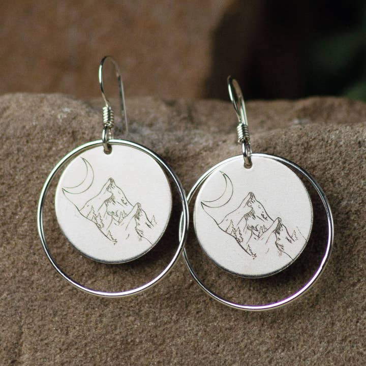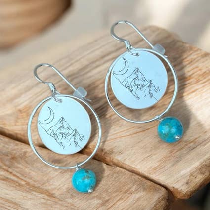 These elegant, engraved .925 sterling silver earrings with genuine Kingman turquoise drops make great gifts and an understated addition to a cocktail dress or any semi-formal outfit. They are also suitable for music festival outfits. Made unique by 5 different laser engraving options: steer skull, mountain, sun & moon, fire, and horse. Certified Made in Montana by the Montana Department of Commerce. - 925 sterling silver - genuine Kingman turquoise (Arizona mined) - French hook ear wires - 5 different engraving options - lightweight earrings - boho sterling silver turquoise earrings - genuine turquoise earrings - bohemian earrings - western earrings - modern earrings - artisan made earrings - boho earrings - elegant earrings - unique silver earrings - made in the USA - certified Made in Montana, USA These earrings have a laser engraved circle of sterling silver in the center. Suitable for rodeos, weddings, birthdays, anniversaries, and other celebrations. Earrings shipped on earring cards inside a clear cellophane pouch.