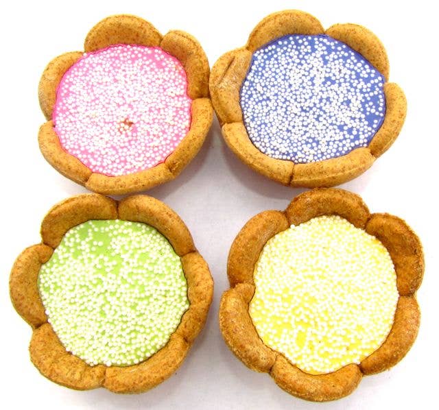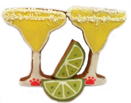 Cookie ingredients: natural creamy peanut butter, water, gluten free all purpose flour (garbanzo bean flour, potato starch, tapioca flour, whole grain sweet white sorghum flour, fava bean flour). Icing ingredients: yogurt powder, tapioca starch, tapioca maltodextrin, coconut milk powder, coconut flour, milk solids, tapioca maltodextrin, apple pectin. Coloring: turmeric. These are 3 inch beer mug shaped treats. These treats are gluten-free and wheat-free. 8 month shelf life. Treats are packaged for shipping only and should be removed from packaging and displayed. Crude moisture 6.8%, crude protein 15.7%, crude fat 21.2%, crude fiber 1.3%.