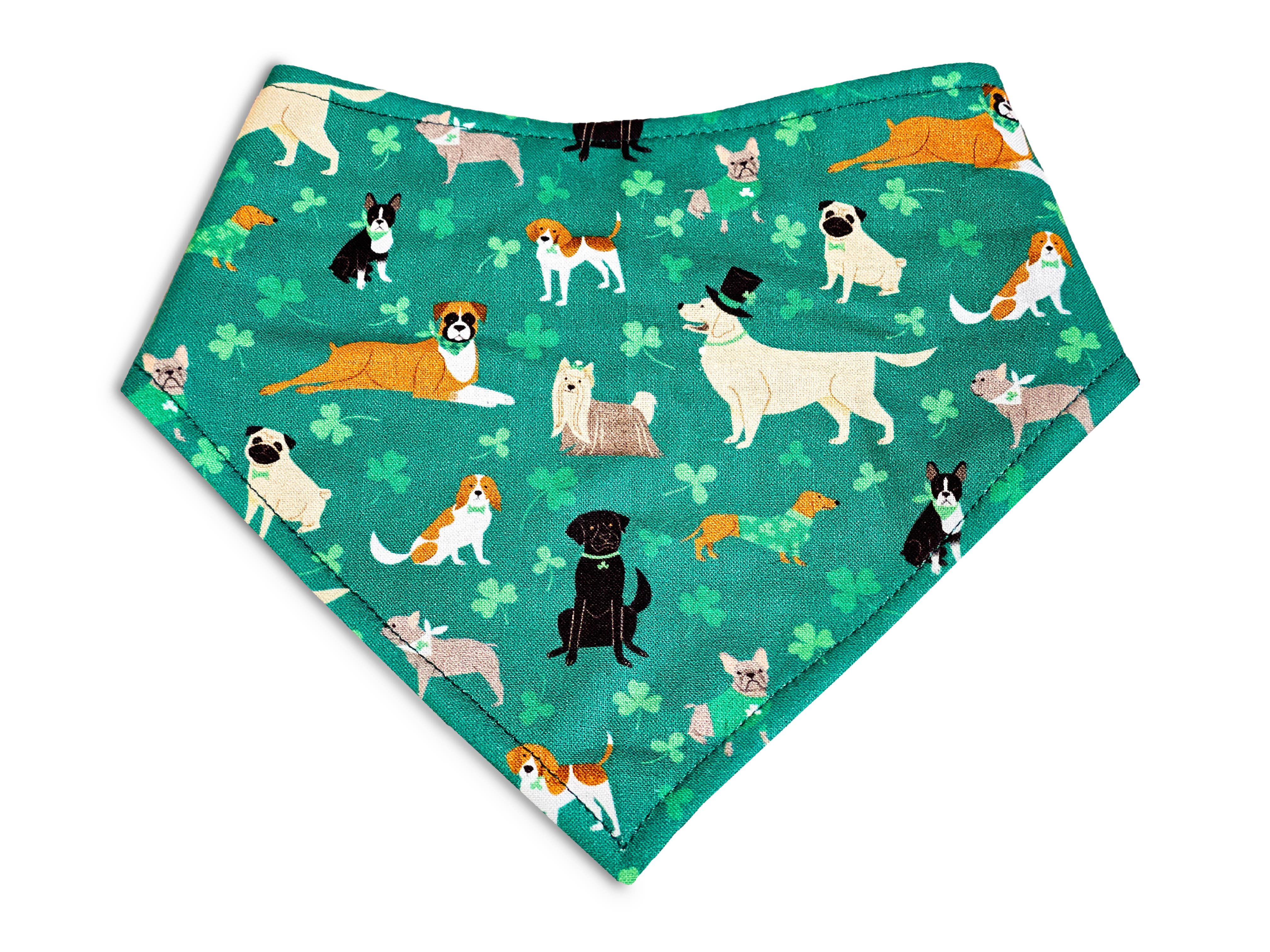 Handcrafted from 100% cotton fabric, our fetchingly fun bandanas are created double-sided with a fun serged edge. They are also adorned with a coordinating snap closure. Feel free to give it a little twist and then snap it to make it a little smaller if needed. Small: 14" from snap to snap, 6" from top edge to point Medium: 18" from snap to snap, 8" from top edge to point Large: 21.5" from snap to snap, 10" from top edge to point