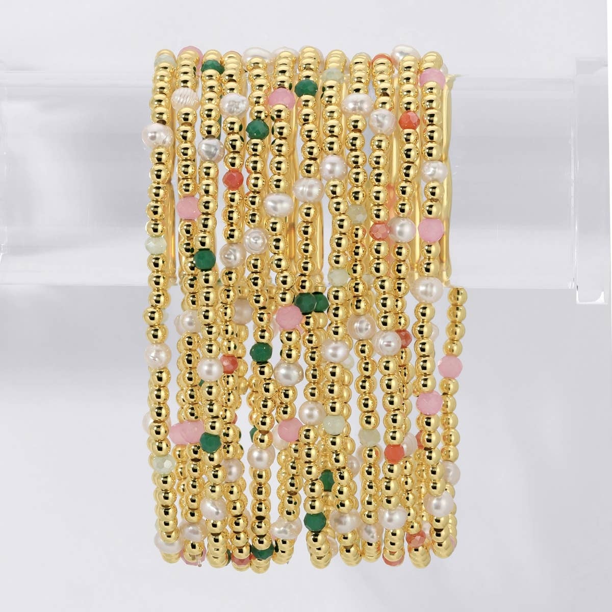 This collection of three bracelets is crafted with Japanese glass and 24k gold-plated beads. Each bracelet is meticulously hand-strung on high-quality crystal stretch cord and is finished with 24k gold-filled knot covers. This stack must be purchased as a set, but your store can sell them as individual units. The most popular size is 6.75 inches
