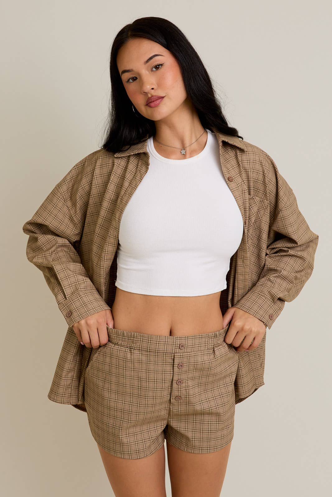 2 pieces set: Checkered tank top with long sleeve collared crop shirt set. 100% Cotton, Lining 100% Polyester The model is wearing a small size. Model size: Height: 5' 3" Bust: 32 C Waist: 24" Model dress size: 1 Model jean size: 3
