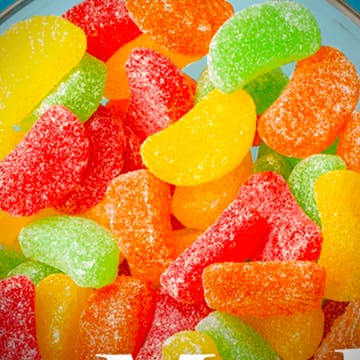 Gourmet Fruit Rainbow Sanded Slices 3/4 Pound w/ Flaire Top These gourmet assorted fruit slices are sure to bring back memories. Nostalgic slices are very flavorful and have unique ridges on each slice. Great bright color to bring your displays alive. Each slice is rolled in sanded sugar and individually packaged into 3/4th Pound Packages. These stand on their own and can be placed directly on your shelf or look great in baskets.