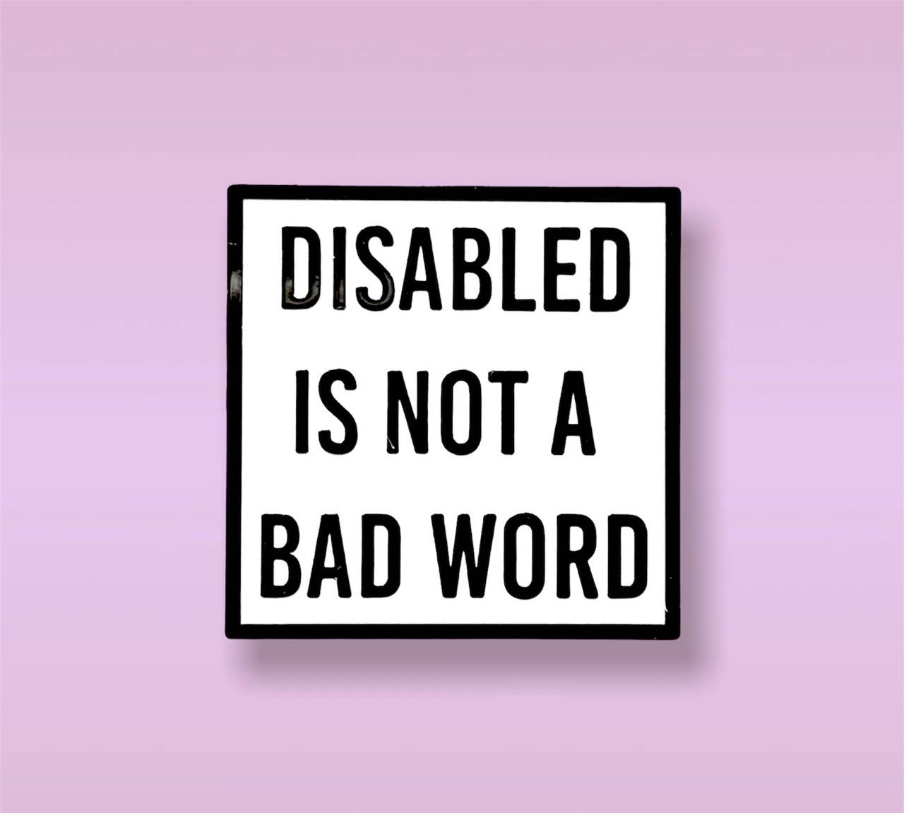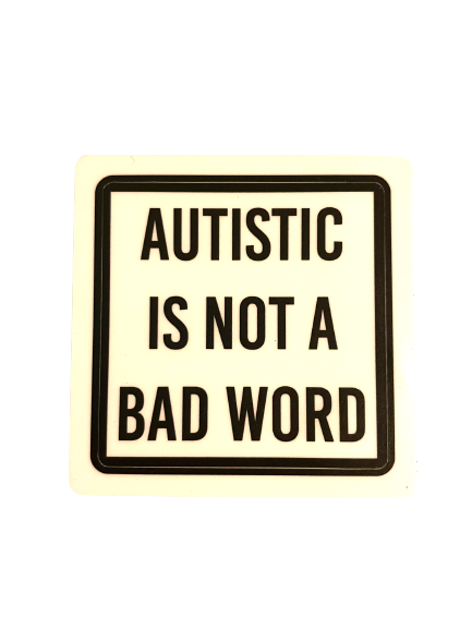 This enamel pin says AUTISTIC IS NOT A BAD WORD, the text is in black and it is on a white, square background with a black square border. It measures 1.25" inches x 1.25" inches. There are two posts on the back with two rubber clutch backings.
