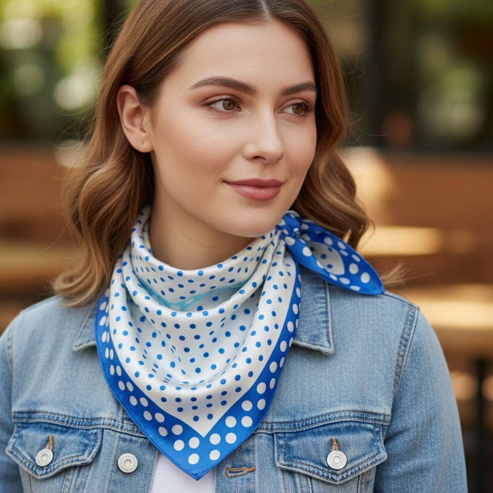 Add extra elegance to any outfit with a lush, 100% silk bandana. Our silks have a luxurious crepe texture, and become beautifully buttery overtime with wear. These silks are created from hand illustrated Flora West designs. This Santorini Floral colorway is a gorgeous blue and white, reminiscent of the colors of Greece. It has a bright royal blue background, and features a delicately hand drawn floral border, and matching florals in a square in the center. Hand rolled edge. * blue is slightly brighter than last run so the florals pop a bit more! Silks measure 23”x23”. This is slightly larger than a standard adult sized bandana at 22”. Folded diagonally, these scarves are large enough to be worn tied around the neck or worn comfortably around the head as a headband. This item is imported. Check our whole collection of silk bandana designs! Add a sample to display, so your shoppers can see the whole design. Comes in a large plastic sleeve.