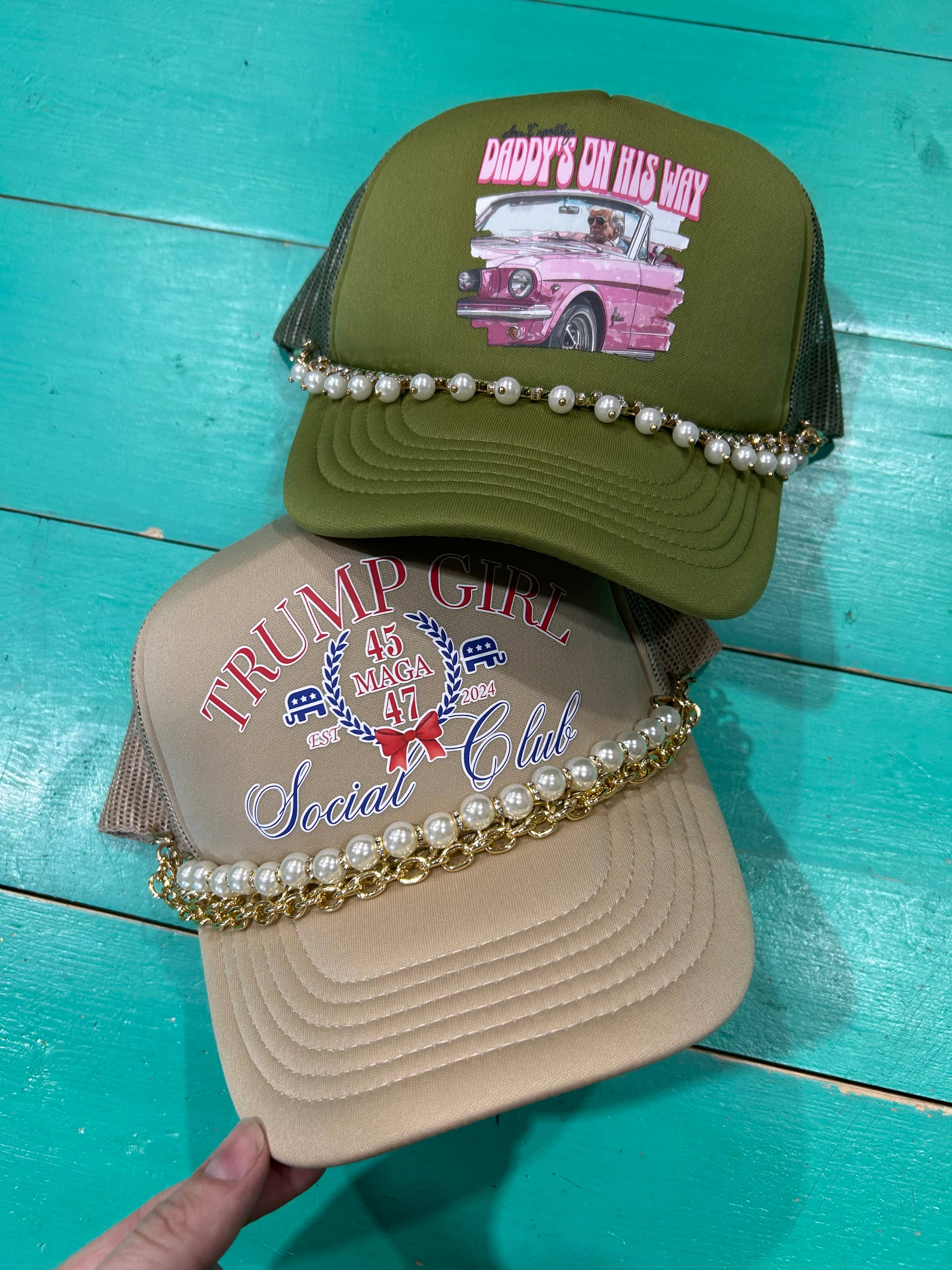 Are you a Trump Girl? Well then, this Trump Girl Social Club trucker hat is for you. Available printed on your favorite color foam trucker hats! Trucker hats have a foam front, mesh back, and an adjustable snapback enclosure. Top it off with the perfect trucker hat chain for trucker hat perfection. Chains not included but sold separately. Pictured here with our Pearl Triple Layer, Chunky White Enamel Dipped, and Pearl Trucker Hat Chains.