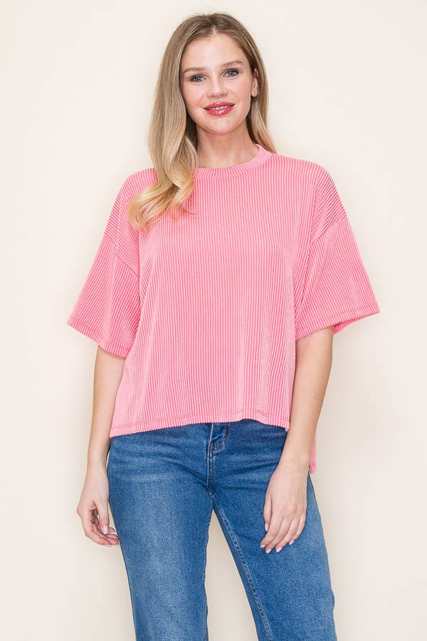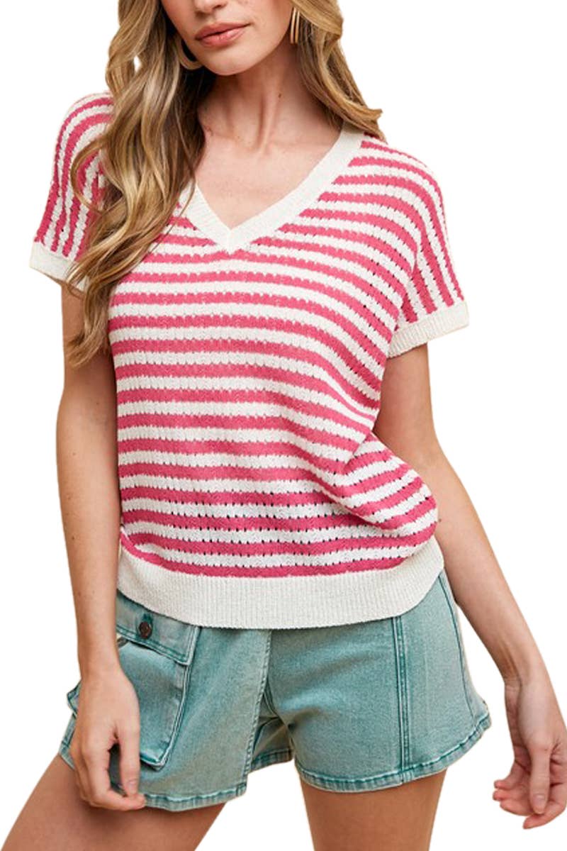 **PLUS SIZE Search for NT12167X** - Oversized Stripe Casual V-Neck Knit Top - Patch Pocket - Short Sleeve - Drop Shoulder (Model height: 5"8", wearing a Small, 2-2-2 Size Ratio, NEW IN)