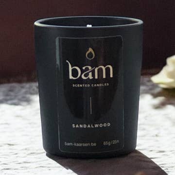 square jar and square dish Burn time: 30 hours Width: 7.5 cm Height: 6.5 cm Content: 106 g The scent of sandalwood in a scented candle is warm, earthy, and soothing. It has a deep, woody base with a soft, creamy sweetness often described as mystical and sensual. The fragrance is full and rich, with subtle hints of spices and a light, almost balsamic-like tone. Our scented candles are made from sunflower wax, hand-poured in our workshop in Frasnes-lez-Anvaing. Sunflower wax is a European product, 100% natural. The great advantage of this wax is that the candles last longer and release few harmful substances for the respiratory system. more info at https://www.bam-kaarsen.be/our-story