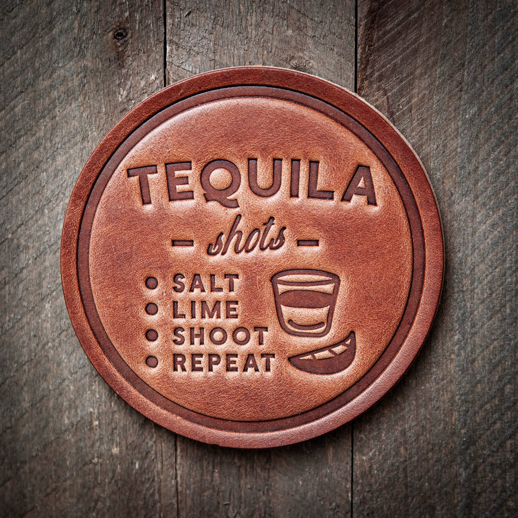 Size: 4" Sold Individually You've found the perfect unique and surprising gift item to offer your customers! Our leather coasters are cut and pressed by hand from some of the thickest and finest harness leather available. They patina beautifully as they age. Customers love the ability to mix and match a variety of styles to make a classic set of coasters that really says, "I picked these out just for you!" We have many more styles planned for the near future, so check back soon and often!