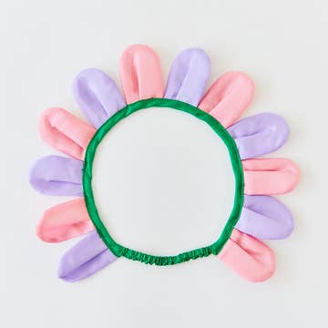 Delicate faux fabric flowers and leaves, on a satin covered headband, suitable for children and small adults.