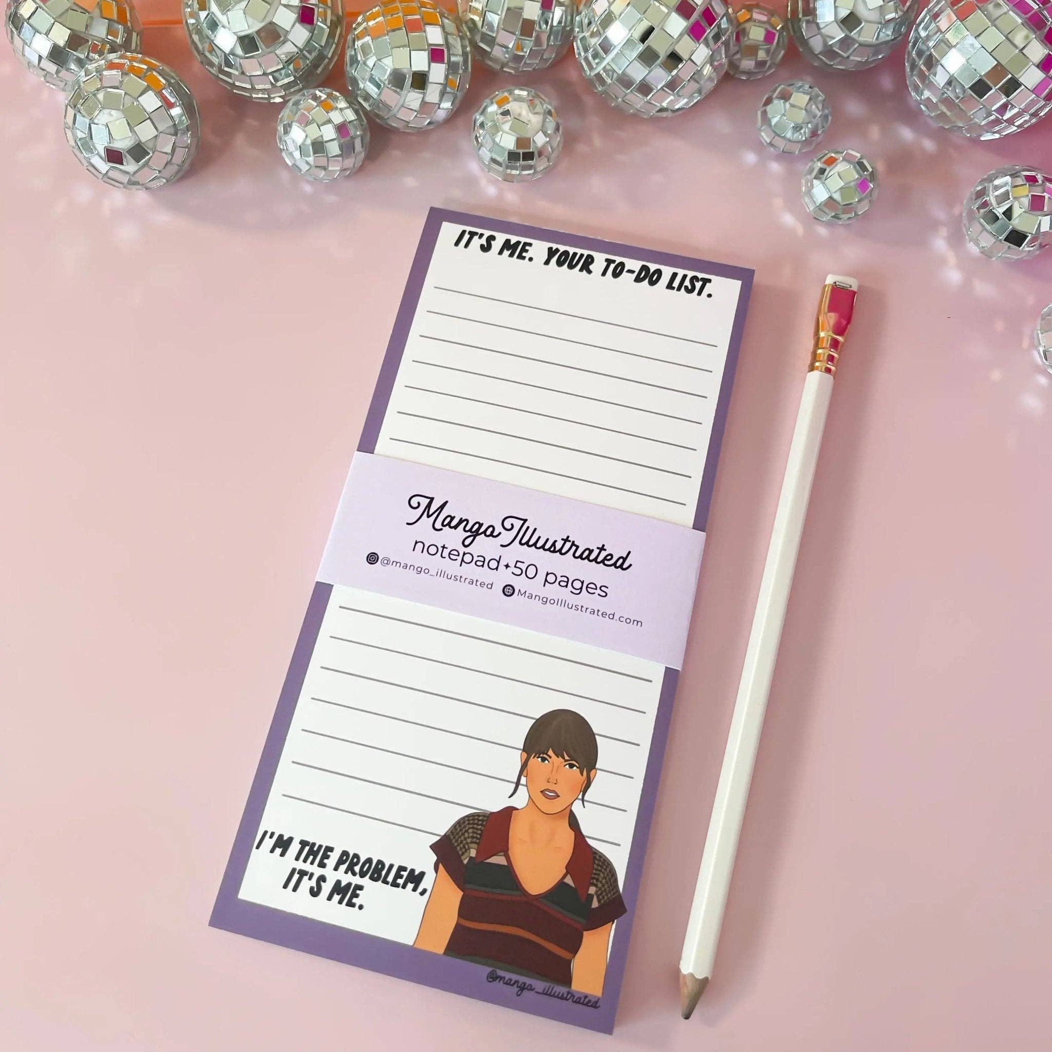 Get those thoughts off your chest and off your desk with this Lavender Haze themed notepad. This notepad features the lyric "get it off my desk" in dark purple hand lettering by me. In the bottom left corner is a hand drawn illustration of Tay in her Lavender Haze Eras Tour outfit. The edges of the notepad are a dark to light lavender gradient. Make sure to check out our Swiftie Stationery shop section for more must-have desk additions! About this notepad - - 50 tear away sheets (gummed at top) - Measures 4" x 5.5" - Cardboard backing - Designed in Charlotte, printed in USA - Packaged safely in a cellophane sleeve **Please note, color of actual notepad may vary slightly due to the settings of the device you are viewing the listing on.